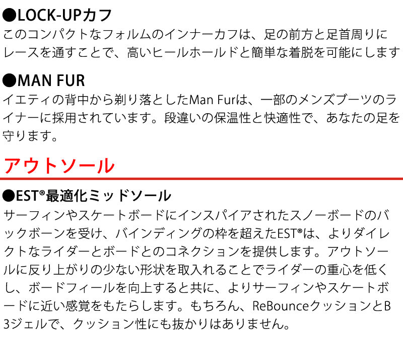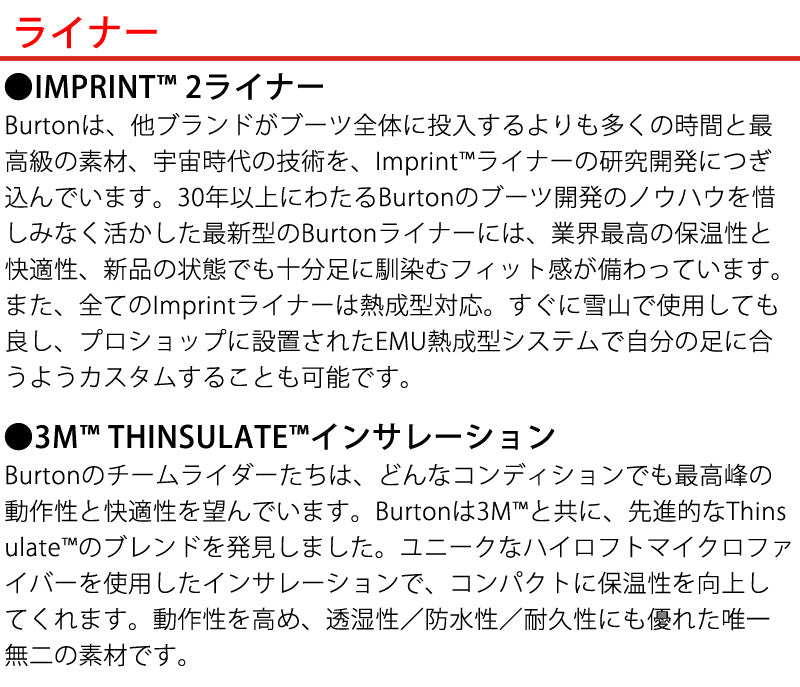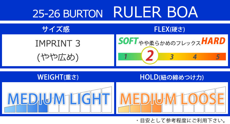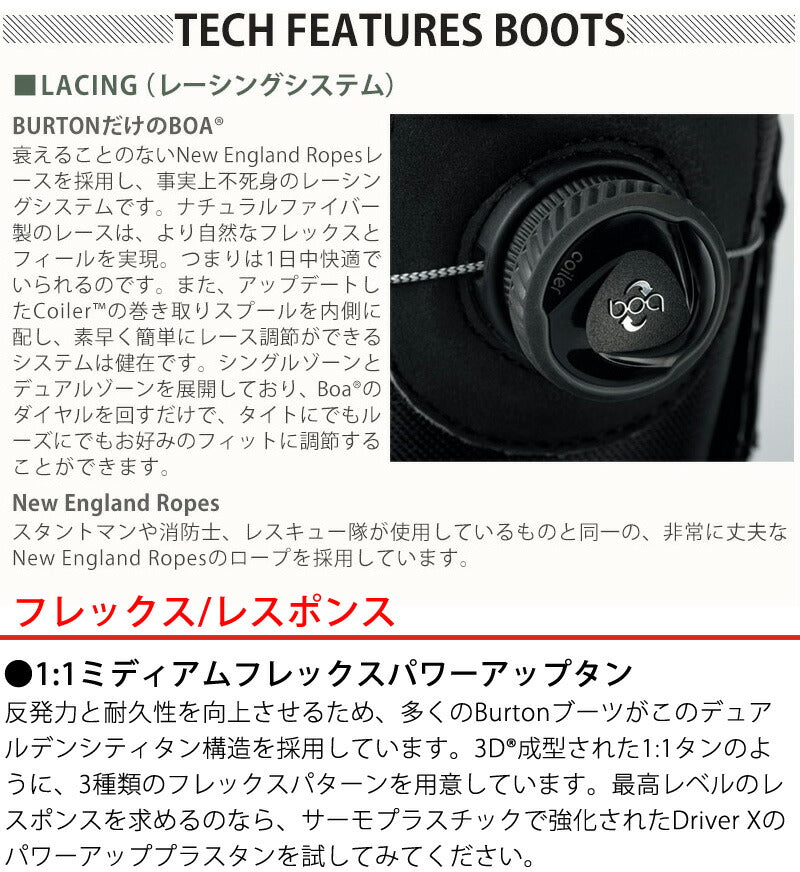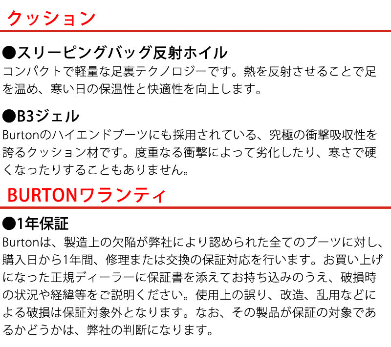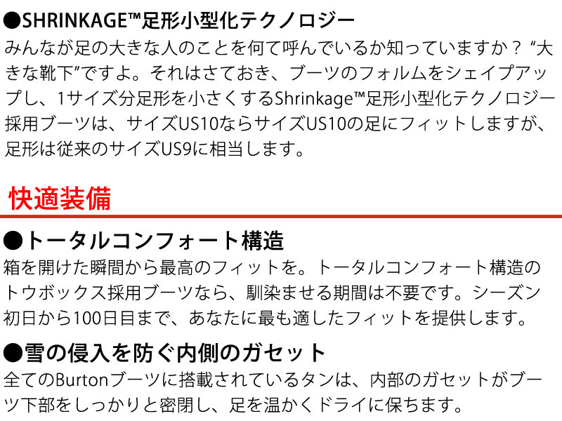 メンズ Burton ルーラー スノーボードブーツは、より大きなドロップや難しい地形、新境地を目指すためのブーツとして、これまでライダーのスキルをプロレベルに押し上げてきました。足前面のテンションを個別にチューニングできるため、思い通りのフィットに微調整することができます。定評あるデザインは、ミディアムな硬さと機敏でパワフルなレスポンスを生み出します。暖かい足元とカスタムフィットで、足元を心配することなくより長くライディングを楽しめます。 ブーツとバインディングの相性やフィッティング、サイズ感に関して等、ご不明な点があればお気軽にお問い合わせください。サイズ交換も当店在庫有りの範囲で対応可能ですので、詳しくはサイズ交換リンクをご確認下さい。 |