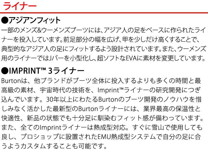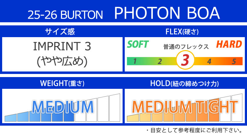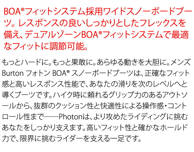 もっとハードに。もっと果敢に。あらゆる動きを大胆に。メンズ Burton フォトン BOA? スノーボードブーツは、正確なフィット感と高いレスポンス性能で、あなたの滑りを次のレベルへと導くブーツです。ハイク時に頼れるグリップ力のあるアウトソールから、抜群のクッション性と快適性による操作感・コントロール性まで――Photonは、より攻めたライディングに挑むあなたをしっかり支えます。高いフィット性と確かなホールド力で、限界に挑むライダーを支える一足です。 ブーツとバインディングの相性やフィッティング、サイズ感に関して等、ご不明な点があればお気軽にお問い合わせください。サイズ交換も当店在庫有りの範囲で対応可能ですので、詳しくはサイズ交換リンクをご確認下さい。 |
