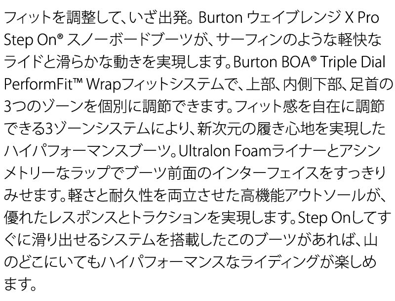 フィットを調整して、いざ出発。Burton ウェイブレンジ X Pro Step On? スノーボードブーツが、サーフィンのような軽快なライドと滑らかな動きを実現します。Burton BOA? Triple Dial PerformFit? Wrapフィットシステムで、上部、内側下部、足首の3つのゾーンを個別に調節できます。フィット感を自在に調節できる3ゾーンシステムにより、新次元の履き心地を実現したハイパフォーマンスブーツ。Ultralon Foamライナーとアシンメトリーなラップでブーツ前面のインターフェイスをすっきりみせます。軽さと耐久性を両立させた高機能アウトソールが、優れたレスポンスとトラクションを実現します。Step Onしてすぐに滑り出せるシステムを搭載したこのブーツがあれば、山のどこにいてもハイパフォーマンスなライディングが楽しめます。 ※こちらはSTEP-ONビンディング専用のブーツとなります。BURTON,NITRO,FLUX,UNIONのSTEP-ONバインに対応しています。 ブーツとバインディングの相性やフィッティング、サイズ感に関して等、ご不明な点があればお気軽にお問い合わせください。 サイズ交換も当店在庫有りの範囲で対応可能ですので、詳しくはサイズ交換リンクをご確認下さい。 ブーツとバインディングの相性やフィッティング、サイズ感に関して等、ご不明な点があればお気軽にお問い合わせください。サイズ交換も当店在庫有りの範囲で対応可能ですので、詳しくはサイズ交換リンクをご確認下さい。 |