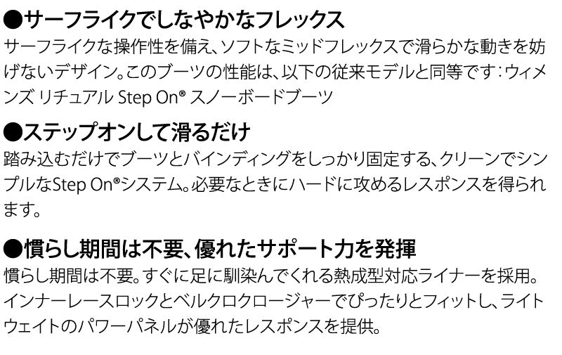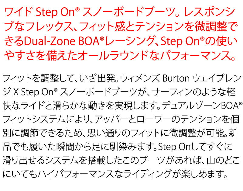 フィットを調整して、いざ出発。ウィメンズ Burton ウェイブレンジ X Step On? スノーボードブーツが、サーフィンのような軽快なライドと滑らかな動きを実現します。デュアルゾーンBOA?フィットシステムにより、アッパーとローワーのテンションを個別に調節できるため、思い通りのフィットに微調整が可能。新品でも履いた瞬間から足に馴染みます。Step Onしてすぐに滑り出せるシステムを搭載したこのブーツがあれば、山のどこにいてもハイパフォーマンスなライディングが楽しめます。 ※こちらはSTEP-ONビンディング専用のブーツとなります。BURTON,NITRO,FLUX,UNIONのSTEP-ONバインに対応しています。 ブーツとバインディングの相性やフィッティング、サイズ感に関して等、ご不明な点があればお気軽にお問い合わせください。 サイズ交換も当店在庫有りの範囲で対応可能ですので、詳しくはサイズ交換リンクをご確認下さい。 ブーツとバインディングの相性やフィッティング、サイズ感に関して等、ご不明な点があればお気軽にお問い合わせください。サイズ交換も当店在庫有りの範囲で対応可能ですので、詳しくはサイズ交換リンクをご確認下さい。 |