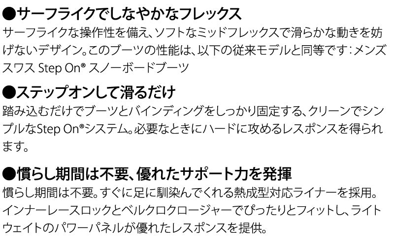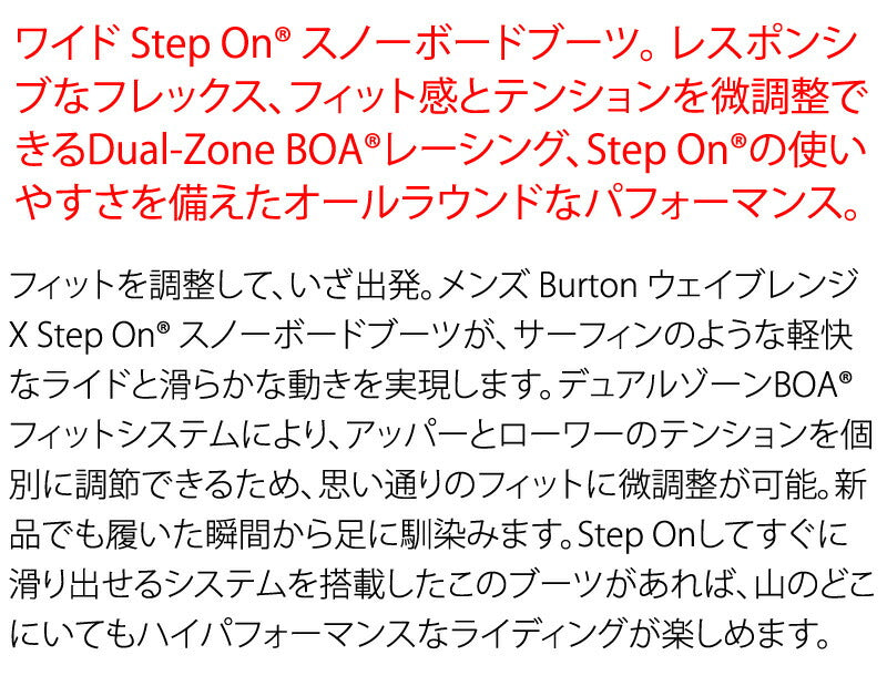 フィットを調整して、いざ出発。メンズ Burton ウェイブレンジ X Step On? スノーボードブーツが、サーフィンのような軽快なライドと滑らかな動きを実現します。デュアルゾーンBOA?フィットシステムにより、アッパーとローワーのテンションを個別に調節できるため、思い通りのフィットに微調整が可能。新品でも履いた瞬間から足に馴染みます。Step Onしてすぐに滑り出せるシステムを搭載したこのブーツがあれば、山のどこにいてもハイパフォーマンスなライディングが楽しめます。 ※こちらはSTEP-ONビンディング専用のブーツとなります。BURTON,NITRO,FLUX,UNIONのSTEP-ONバインに対応しています。 ブーツとバインディングの相性やフィッティング、サイズ感に関して等、ご不明な点があればお気軽にお問い合わせください。 サイズ交換も当店在庫有りの範囲で対応可能ですので、詳しくはサイズ交換リンクをご確認下さい。 ブーツとバインディングの相性やフィッティング、サイズ感に関して等、ご不明な点があればお気軽にお問い合わせください。サイズ交換も当店在庫有りの範囲で対応可能ですので、詳しくはサイズ交換リンクをご確認下さい。 |