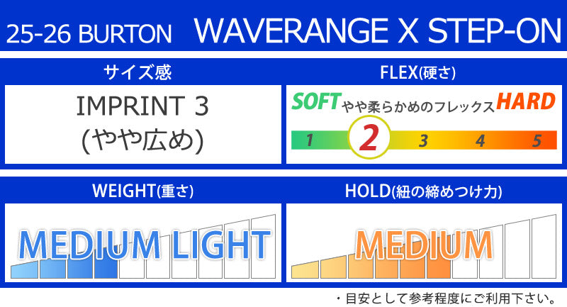 | ベストマッチ ビンディング | ・BURTON FLUX UNION NITRO/バートン フラックス ユニオン ナイトロ ※ご使用サイズやモデル等で変わる部分もございますのであくまで目安としてお考え下さい。 こちらに記載以外のバインディングにも使用可能です。 |