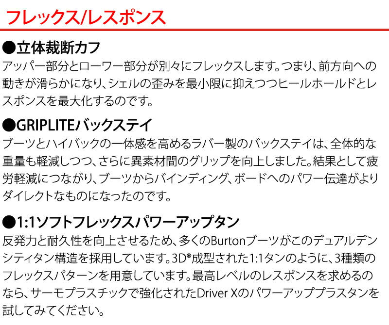 | ベストマッチ ビンディング | ・BURTON/バートン ※ご使用サイズやモデル等で変わる部分もございますのであくまで目安としてお考え下さい。 こちらに記載以外のバインディングにも使用可能です。 |