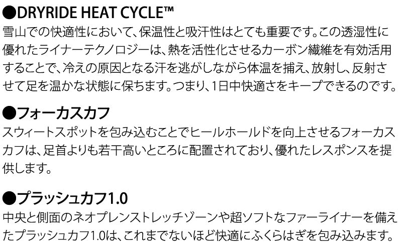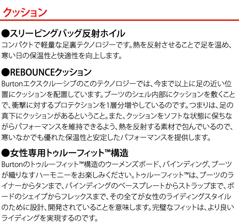 ウィメンズ Burton リチュアル BOA? スノーボードブーツは、他とは一線を画すブーツ。足を包み込むような快適性と、クッションが軽い履き心地を実現。あらゆる地形でのライディングに対応する中程度の硬さです。驚くほど軽い履き心地と自在なフィット調整で、グルーミングバーンからツリーラン、パークやナチュラル地形まで、一日中自由に滑り倒せます。最も暖かいライナーを採用し、足元は一日中快適。次に滑るライン選びに集中できます。 ブーツとバインディングの相性やフィッティング、サイズ感に関して等、ご不明な点があればお気軽にお問い合わせください。サイズ交換も当店在庫有りの範囲で対応可能ですので、詳しくはサイズ交換リンクをご確認下さい。 |