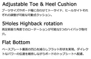 さらなるレスポンスアップと軽快な動きやすさを両立。 ボードへの力の伝達効率を重視したベース設計はそのままに、大型のスタビライザーをヒールサイドに採用。 反発性に優れた素材を使用することで左右への可動域を拡げながらもボードに力を逃がすことなく伝えることができます。 また、Boost FootOn+は、通常のフットベッドより4mm高さをあげることに加え、センター部を柔らかくすることで、踏み込んだ際にコンケーブ形状となり、より力強いエッジングを可能としました。 バインディングとブーツの相性やフィッティングに関して等、ご不明な点があればお気軽にお問い合わせください。 ※滑走での振動やストラップの着脱等でビスを使用している部分は緩んできますので、締り具合など滑走前に必ずご確認をお願いします。またご使用のブーツとストラップの調整をお願いいたします。調整が適切でない場合、負荷が集中し破損の原因となります。 |