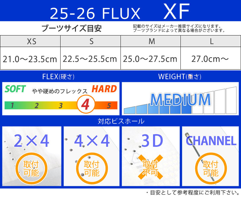 | ベストマッチブーツ | ・FLUX/フラックス ※ご使用サイズやモデル等で変わる部分もございますのであくまで目安としてお考え下さい。 こちらに記載以外のバインディングにも使用可能です。 |