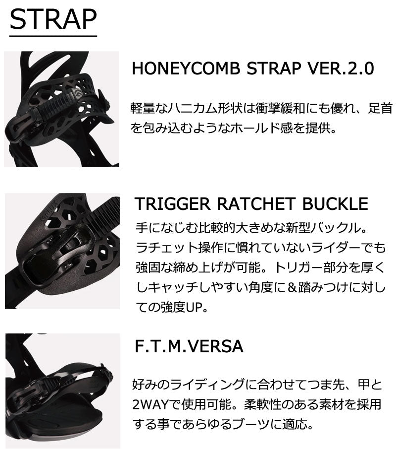 ※滑走での振動やストラップの着脱等でビスを使用している部分は緩んできますので、締り具合など滑走前に必ずご確認をお願いします。またご使用のブーツとストラップの調整をお願いいたします。調整が適切でない場合、負荷が集中し破損の原因となります。