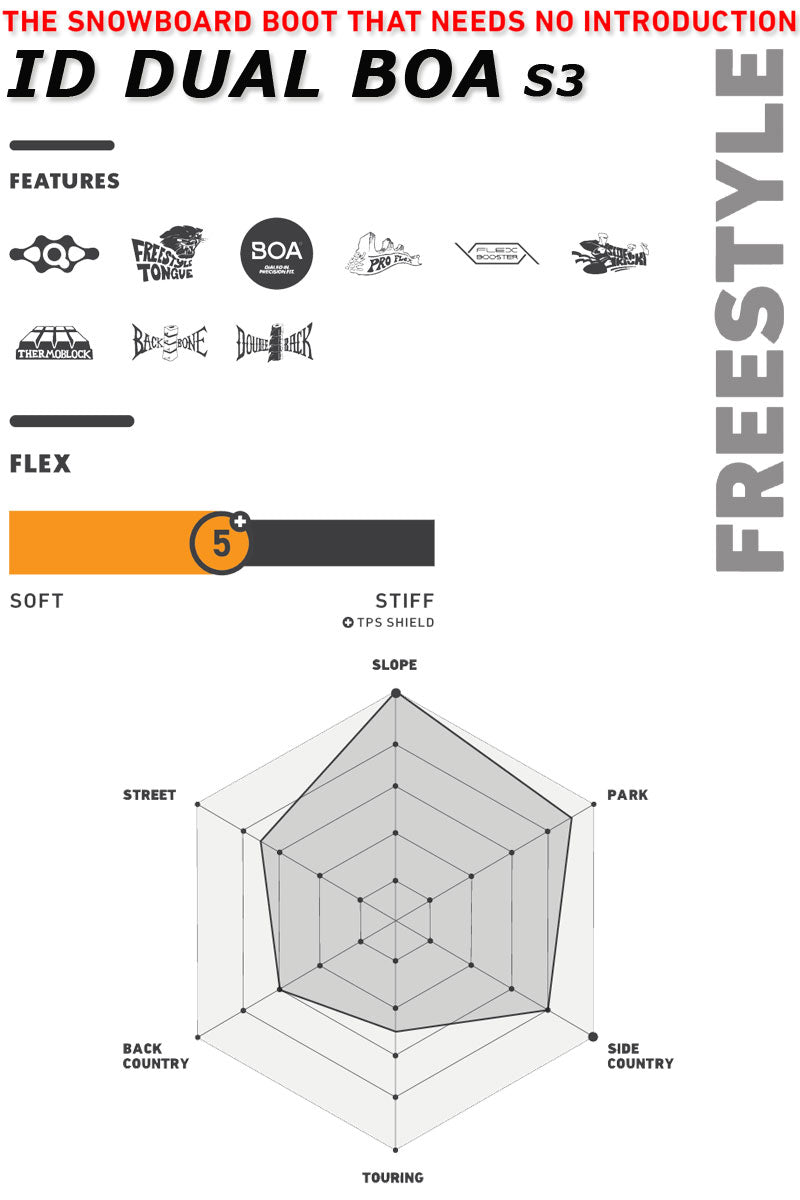 もはや説明不要のスノーボードブーツ、IDの登場です。 単なるフットウェアにとどまらない、まさに伝説のブーツです。20年間の革新と卓越性を誇ります。ライダーなら誰もがその名を知り、きっとあなたも一度は試したことのあるブーツでしょう。 このアニバーサリーエディションは、そのルーツに忠実であり、定番の要素を体現しながらも、パフォーマンスを向上させる最新の改良点を取り入れています。 IDには、実績のあるクォンタムソールが搭載されています。このソールは、特にダイレクトでレスポンスに優れた乗り心地を提供すると同時に、振動を抑制し、衝撃エネルギーを吸収する効果的なクッション性も備えています。 ダブルバックは、バインディングによる摩耗からさらに保護し、コントロールと精度を向上させます。 ブーツの環境への影響を最小限に抑えることを目指し、シェルにはRise by Bloom(危機に瀕した生態系から採取された藻類由来のバイオベースフォーム)が使用されています。 栄光の日々を懐かしむ方も、初めて体験する方も、IDは真のクラシックの究極の進化形であり、これまで以上に優れたモデルです。 インナーの代名詞ともなった「サーモインナー」と呼ばれる熱成型インナーを武器に、幅広いスノーボーダーに人気のオーストリアのスノーボードブーツ専門ブランドDEELUXE。 ※こちらはSTAGE3 LINER(熱成型可能なサーモインナー)となり、成型なしでも使用可能ですが熱成型加工を行うと加工前よりフィット感が向上します。フィット感を向上されたい方で熱成型をお考えの方はご購入前に持ち込み成型可能ショップをご確認ください。 当店ブレイクアウトでも熱成型受け付けております。 ブーツとバインディングの相性やフィッティング、サイズ感に関して等、ご不明な点があればお気軽にお問い合わせください。サイズ交換も当店在庫有りの範囲で対応可能ですので、詳しくはサイズ交換リンクをご確認下さい。 |