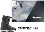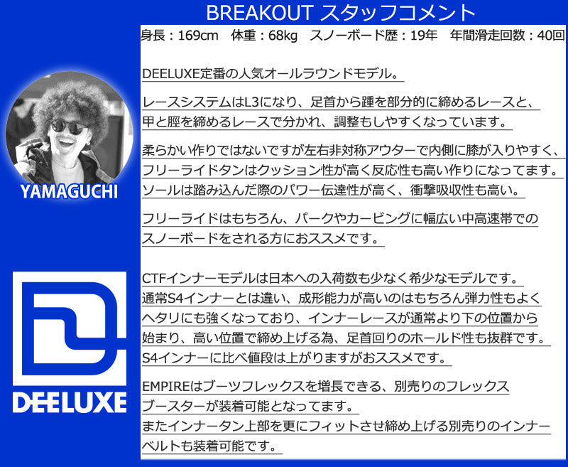 山全体があなたの領域なら、Empireがあなたを待っています。 非対称フレックス構造で愛され、高く評価されているこのオールテレーンブーツは、真にユニークなライディング体験を提供します。バンクスラロームにドロップインしたり、シュートで岩をかわしたり、パウダースノーの日に木々の間を駆け抜けたり。 Empireは、スムーズでありながら素早いターンを可能にします。フリーライドタンは耐久性を高め、ライダーがブーツのフレックスをさらにカスタマイズできるようにします。また、L3レーシングシステムを搭載し、より優れたフィット感とレスポンスを実現します。 そして、このブーツの伝説的なパフォーマンスの証として、日本のフリーラン誌は最近、エンパイアをベストギア賞に選出し、最高のフリーライドブーツに選出しました。 エンパイアですべてを制覇しましょう。 インナーの代名詞ともなった「サーモインナー」と呼ばれる熱成型インナーを武器に、幅広いスノーボーダーに人気のオーストリアのスノーボードブーツ専門ブランドDEELUXE。 ※こちらはCTF LINER(熱成型可能なサーモインナー)となり、成型なしでも使用可能ですが熱成型加工を行うと加工前より大きくフィット感が向上します。フィット感を向上されたい方で熱成型をお考えの方はご購入前に持ち込み成型可能ショップをご確認ください。 当店ブレイクアウトでも熱成型受け付けております。 ブーツとバインディングの相性やフィッティング、サイズ感に関して等、ご不明な点があればお気軽にお問い合わせください。サイズ交換も当店在庫有りの範囲で対応可能ですので、詳しくはサイズ交換リンクをご確認下さい。 |