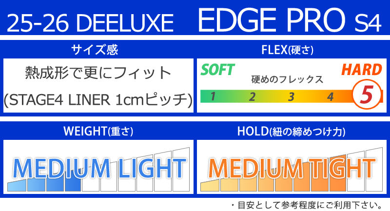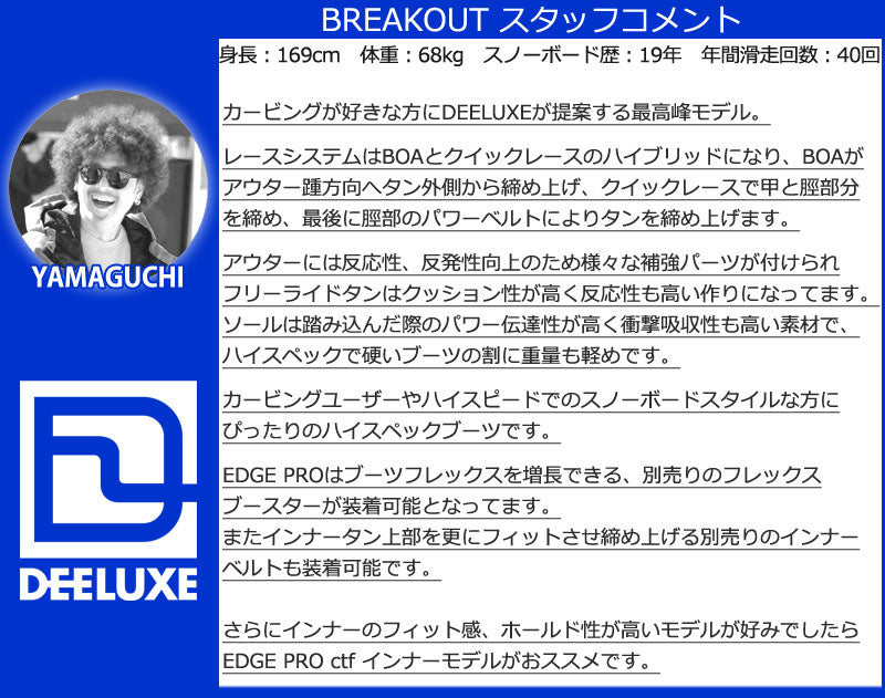 全開で攻める時、Edge Proは何も隠しません。スピードへの渇望と精度へのこだわりを武器に、この全地形対応フリースタイルブーツは、カービングを楽しみ、サイドヒットを狙うライダーに最適です。 ブーツの履き口がサポート力を高め、Sidekick Proテクノロジーは高周波溶接プロセスを用いて、ブーツのシェルに横方向と内側の補強要素を融合。これにより、エッジからエッジへの切り替えが速くなり、オーリー時の反発力が向上します。 さらに、独自のBattleソールにより、ボードフィールを最大限に高めながら、衝撃から保護する高度なクッション性も備えています。 環境への影響を最小限に抑えるため、シェルにはRise by Bloomを使用しています。これは、危機に瀕した生態系から採取された藻類から作られたバイオベースのフォームです。このアプローチは、藻類の炭素固定能力を活用し、水質浄化と水生生息地の回復を促進します。 Edge Proで、期待と水準を高めましょう。 インナーの代名詞ともなった「サーモインナー」と呼ばれる熱成型インナーを武器に、幅広いスノーボーダーに人気のオーストリアのスノーボードブーツ専門ブランドDEELUXE。 ※こちらはSTAGE4 LINER(熱成型可能なサーモインナー)となり、成型なしでも使用可能ですが熱成型加工を行うと加工前より大きくフィット感が向上します。フィット感を向上されたい方で熱成型をお考えの方はご購入前に持ち込み成型可能ショップをご確認ください。 当店ブレイクアウトでも熱成型受け付けております。 ブーツとバインディングの相性やフィッティング、サイズ感に関して等、ご不明な点があればお気軽にお問い合わせください。サイズ交換も当店在庫有りの範囲で対応可能ですので、詳しくはサイズ交換リンクをご確認下さい。 |