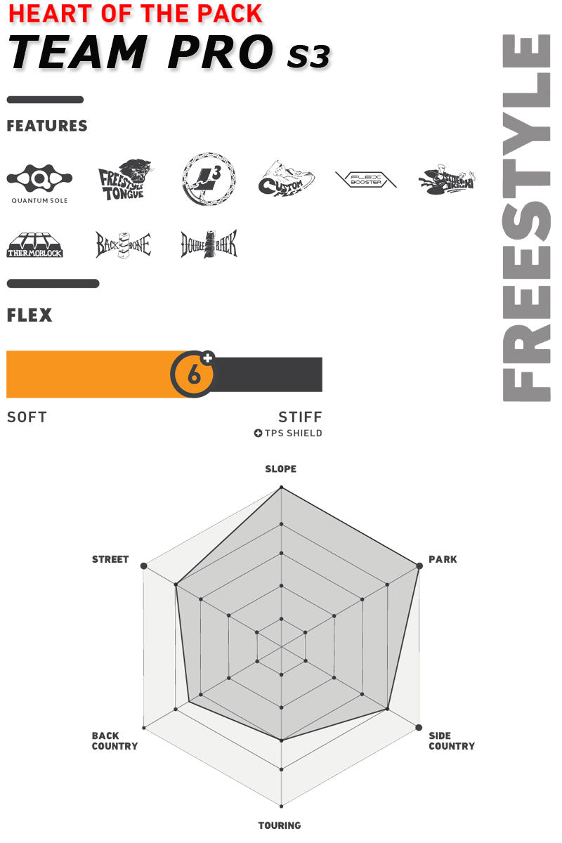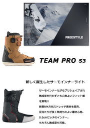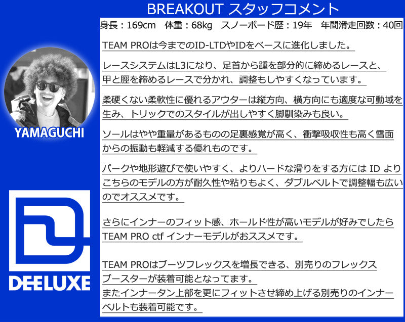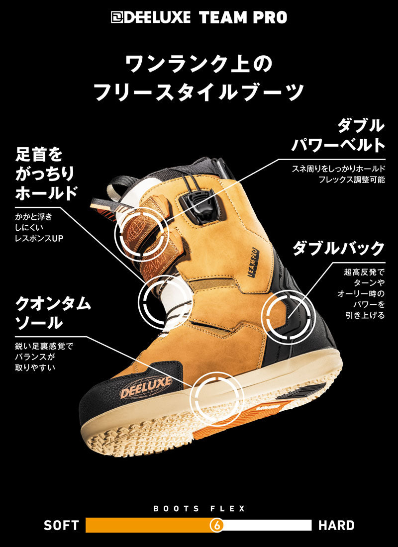 Team Proは、DEELUXEブーツの中でも最も人気のあるTeamID LTDのアイデアを基に開発されました。 これまではチーム限定販売だったこの限定モデルが、世界中のライダーにお楽しみいただけます。 ミッドソフトフレックスを採用したこのフリースタイルブーツは、斬新な快適さとサポートを求めるライダーに最適です。山全体を遊び場にするために、Team ProにはQuantumソールを搭載しました。このソールは、特にダイレクトでレスポンスに優れた乗り心地を提供すると同時に、振動を抑制し衝撃エネルギーを吸収する効果的なクッション性も備えています。そしてハイキング時には、Quantumソールが優れたトラクションを発揮します。 ブーツの環境への影響を最小限に抑えるため、ダブルパワーストラップとエイミングストラップを組み合わせ、シェルにはRise by Bloom(生態系の悪化から採取された藻類由来のバイオベースフォーム)を採用しています。 L3レーシングを搭載したTeam Proは、優れたヒールホールドと卓越したボードコントロールを提供します。 ダブルバックは、締め付けによる摩耗からさらに保護し、コントロールと精度を向上させます。 Team Proで、あなたのゲームを新たな高みへと導きましょう。 インナーの代名詞ともなった「サーモインナー」と呼ばれる熱成型インナーを武器に、幅広いスノーボーダーに人気のオーストリアのスノーボードブーツ専門ブランドDEELUXE。 ※こちらはSTAGE3 LINER(熱成型可能なサーモインナー)となり、成型なしでも使用可能ですが熱成型加工を行うと加工前よりフィット感が向上します。フィット感を向上されたい方で熱成型をお考えの方はご購入前に持ち込み成型可能ショップをご確認ください。 当店ブレイクアウトでも熱成型受け付けております。 ブーツとバインディングの相性やフィッティング、サイズ感に関して等、ご不明な点があればお気軽にお問い合わせください。サイズ交換も当店在庫有りの範囲で対応可能ですので、詳しくはサイズ交換リンクをご確認下さい。 |