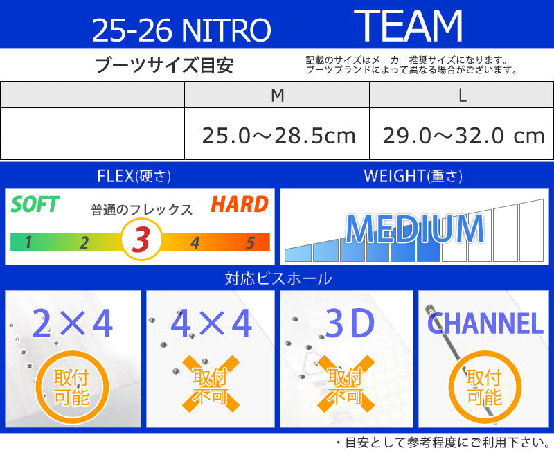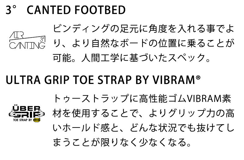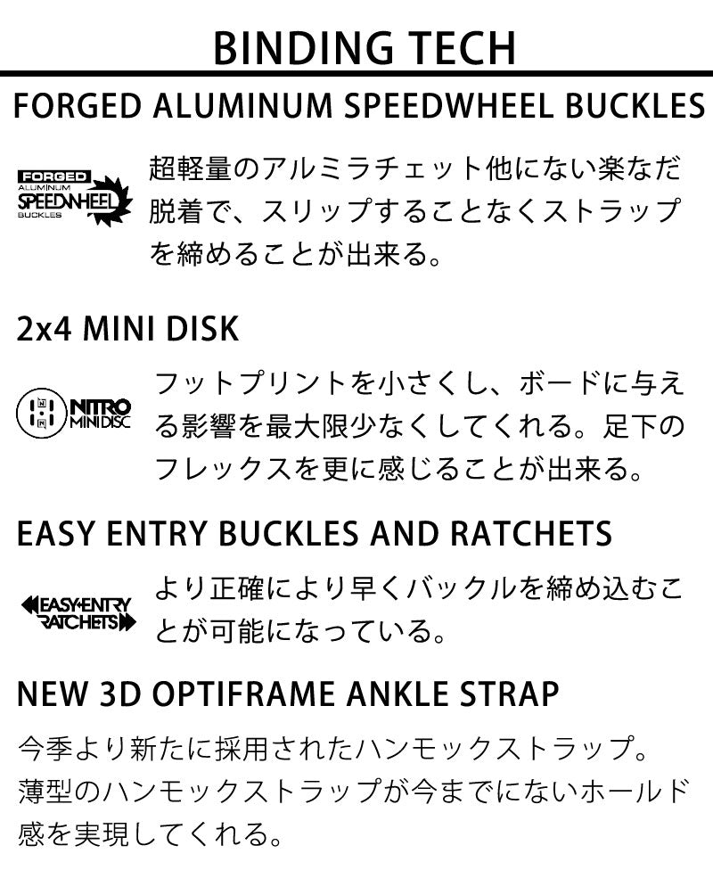 | ベストマッチブーツ | ・NITRO/ナイトロ ※ご使用サイズやモデル等で変わる部分もございますのであくまで目安としてお考え下さい。 こちらに記載以外のバインディングにも使用可能です。 |