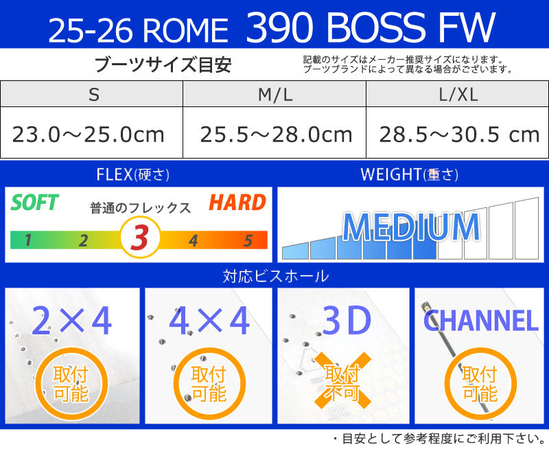 | ベストマッチブーツ | ・ROME/ローム ※ご使用サイズやモデル等で変わる部分もございますのであくまで目安としてお考え下さい。 こちらに記載以外のバインディングにも使用可能です。 |