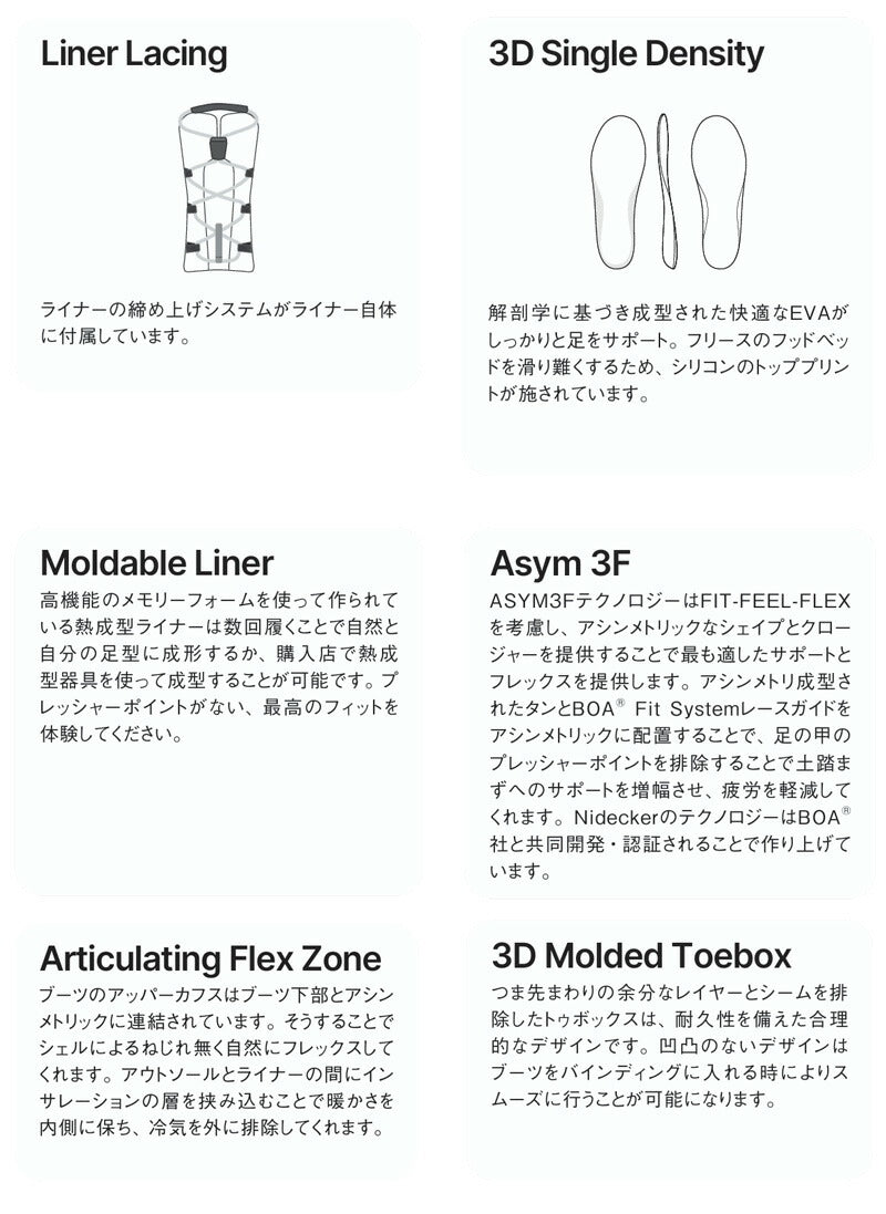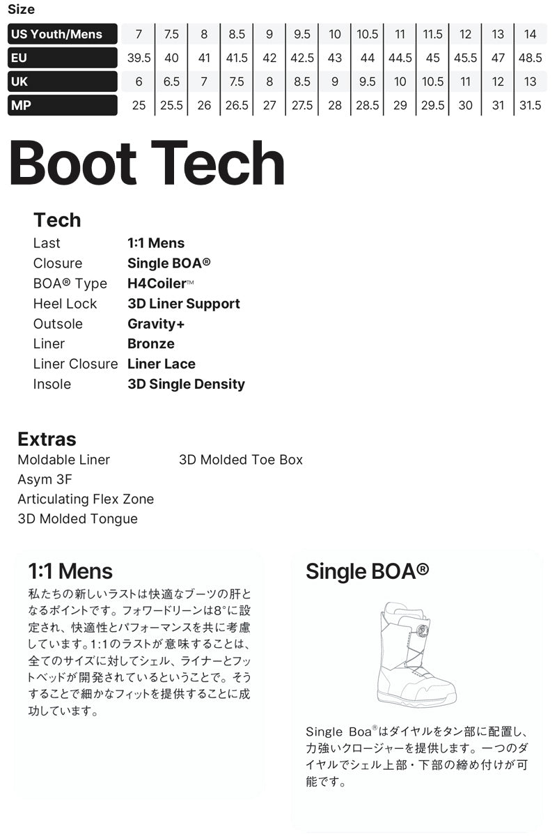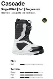 Cascadeは、まさに主力モデル。 箱から出してすぐに驚くほどフィットし、あらゆる地形で軽量かつ柔軟なサポートを提供する。 BOAダイヤル1つでシンプルかつ正確に、アッパー部分を非対称にすることでレーシングシステムをよりサポートし、快適性を最大限に高めている。 熱成型可能なライナーとアップグレードされた3Dトゥボックスを備えたこのブーツは、上達を早めるのに十分な寛容さと、何年も使えるタフさを併せ持つ、理想的なファーストブーツである。 ブーツとバインディングの相性やフィッティング、サイズ感に関して等、ご不明な点があればお気軽にお問い合わせください。サイズ交換も当店在庫有りの範囲で対応可能ですので、詳しくはサイズ交換リンクをご確認下さい。 |