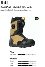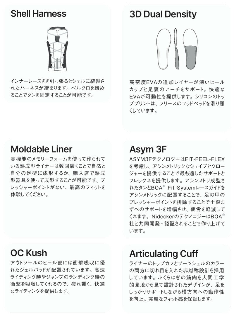 Riftは、パークラップ、ソウルターン、そしてクリエイティブなオールマウンテンシュラルピングに最適な、よりソフトなブーツです。 スニーカーのようなルックスと最高級素材を融合した軽量デザイン。 関節式2パーツシェルは、激しい動きや片側への圧力がかかっても変形しません 。デュアルダイヤルBO?レースで完璧なフィット感をコントロール。 OC-Kushジェルダンピングとシルバーの熱成型ライナーが、履いたその日から最高の快適さを提供します。 ブーツとバインディングの相性やフィッティング、サイズ感に関して等、ご不明な点があればお気軽にお問い合わせください。サイズ交換も当店在庫有りの範囲で対応可能ですので、詳しくはサイズ交換リンクをご確認下さい。 |