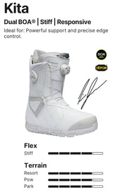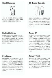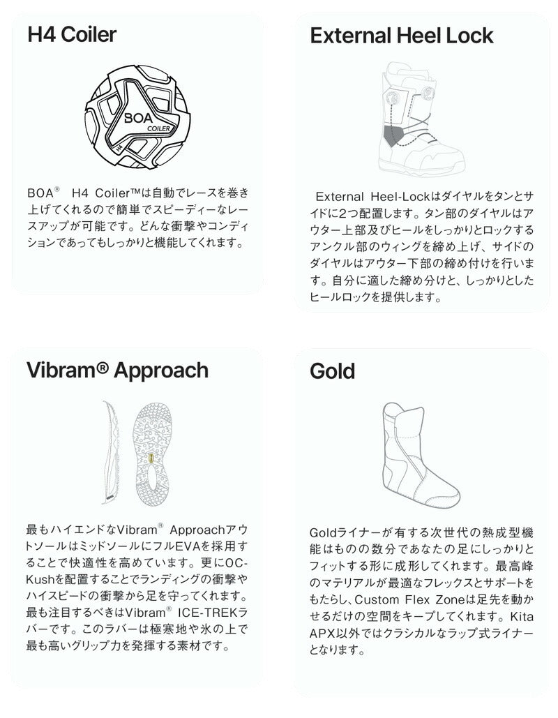 極地や山岳探検の技術的要求にインスパイアされたKitaは、最初のリフトから最後のリフトまで、信頼できるパフォーマンスを発揮する機能を満載しています。 快適性は最重要事項であり、プレミアムなゴールドラップライナーと、バインディングに完璧にフィットする非対称シェイプがボードとの自然な一体感を生み出します。 デュアルダイヤルBOAレース、独自のシームレス構造、そしてArmor-Techのつま先保護が、あらゆる地形を制覇する強力なモデルを完成させます。 エリック・ジャクソンの愛用ブーツであるKitaは、Ejackのシグネチャーカラーウェイで展開されます。 カモフラージュ柄は、彼のお気に入りのパウダーラインにある焼け焦げた木からインスピレーションを得ています。 ブーツとバインディングの相性やフィッティング、サイズ感に関して等、ご不明な点があればお気軽にお問い合わせください。サイズ交換も当店在庫有りの範囲で対応可能ですので、詳しくはサイズ交換リンクをご確認下さい。 |