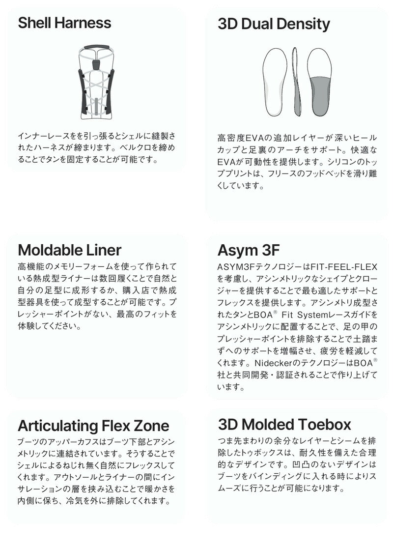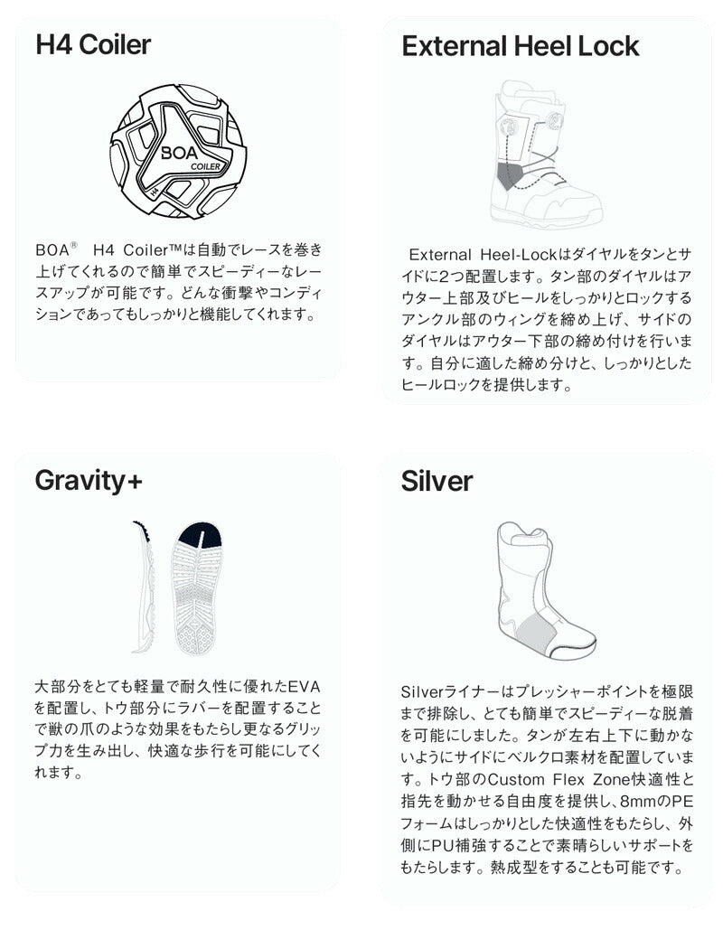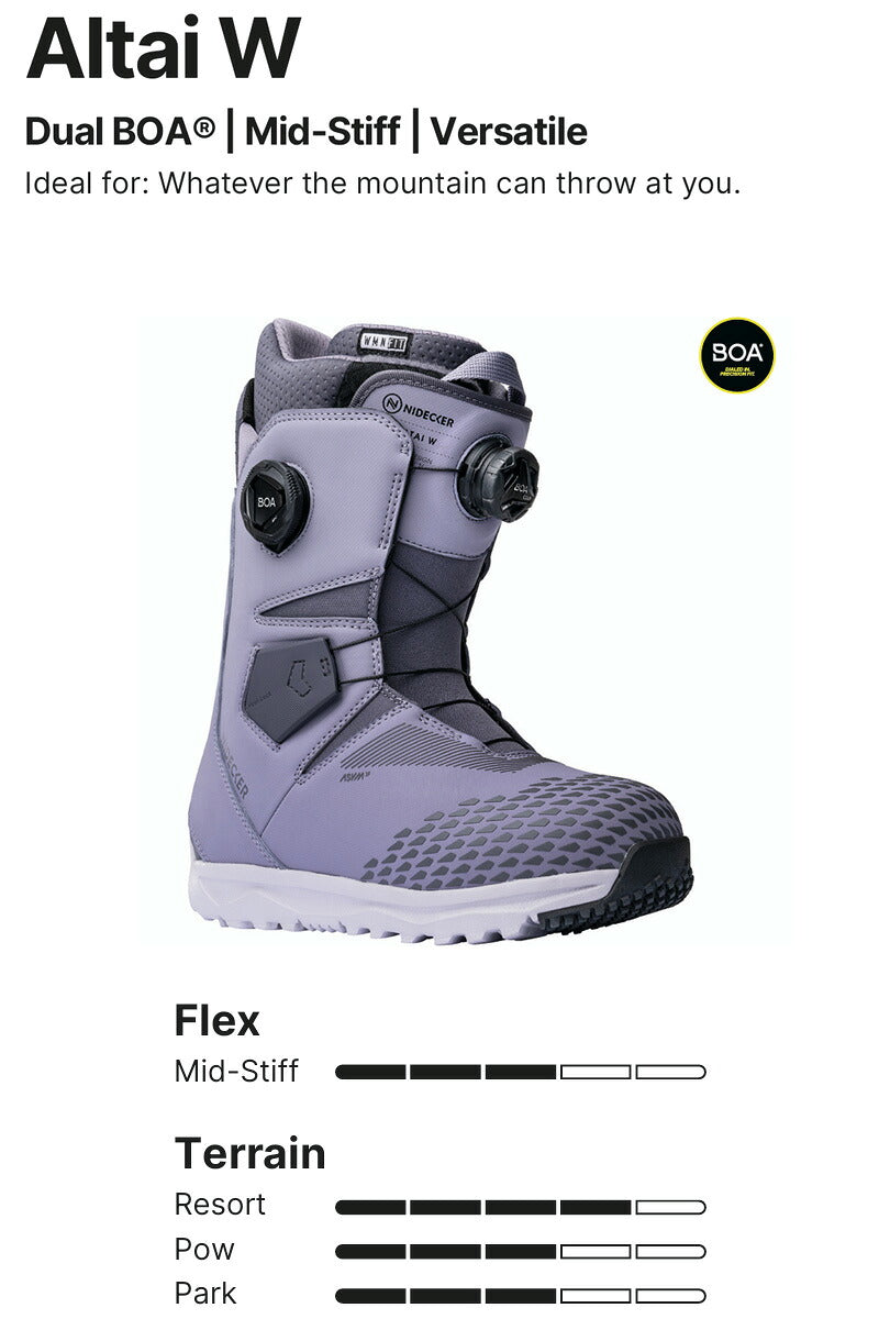Altai Advances ベストセラーのAltaiが2026年冬に向けて進化 新しい外付けヒールロックとインジェクションシューレースガイドでコントロール性を強化。 また、シルバーライナーが快適性と足首のサポート性を高め、最新素材がクリーンな外観を実現。 オールマウンテンで活躍する新しいブーツの登場だ。 ブーツとバインディングの相性やフィッティング、サイズ感に関して等、ご不明な点があればお気軽にお問い合わせください。サイズ交換も当店在庫有りの範囲で対応可能ですので、詳しくはサイズ交換リンクをご確認下さい。 |
