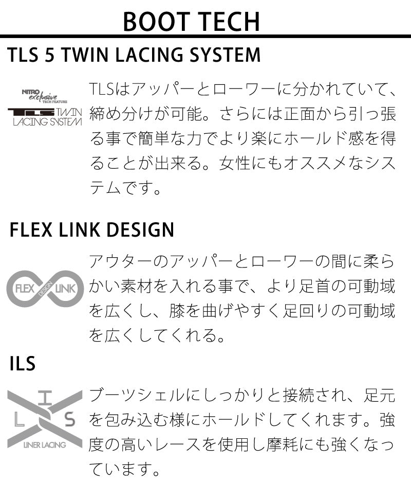 柔らかく、パークライディングや、ジブトリック、グラトリなどの足首回りを柔らかく扱いたいレディースライダー向け。 ブーツとバインディングの相性やフィッティング、サイズ感に関して等、ご不明な点があればお気軽にお問い合わせください。サイズ交換も当店在庫有りの範囲で対応可能ですので、詳しくはサイズ交換リンクをご確認下さい。 |