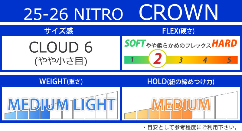 | ベストマッチ ビンディング | ・NITRO/ナイトロ ※ご使用サイズやモデル等で変わる部分もございますのであくまで目安としてお考え下さい。 こちらに記載以外のバインディングにも使用可能です。 |