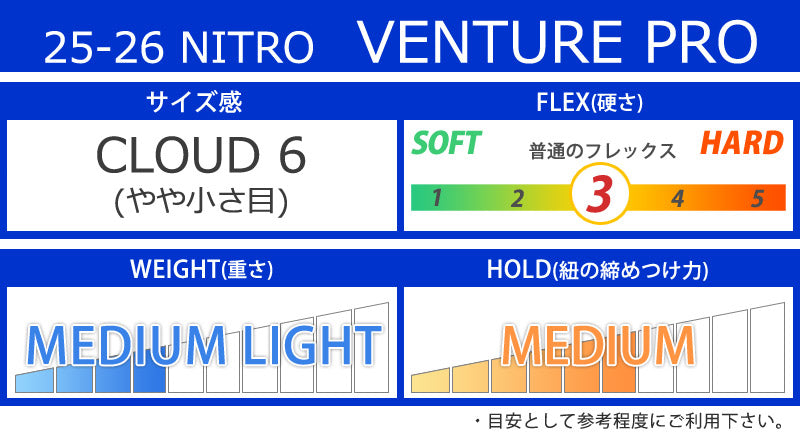 | ベストマッチ ビンディング | ・NITRO/ナイトロ ※ご使用サイズやモデル等で変わる部分もございますのであくまで目安としてお考え下さい。 こちらに記載以外のバインディングにも使用可能です。 |