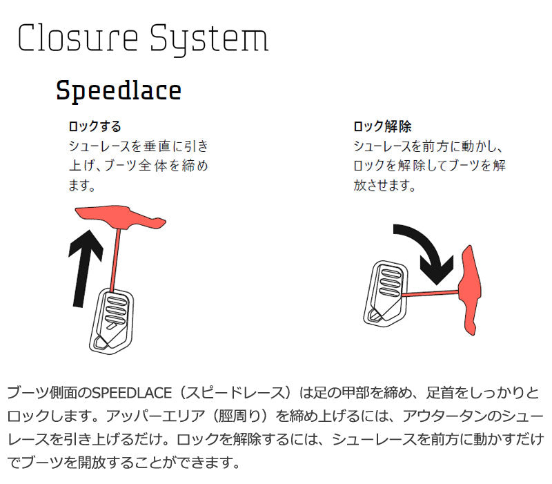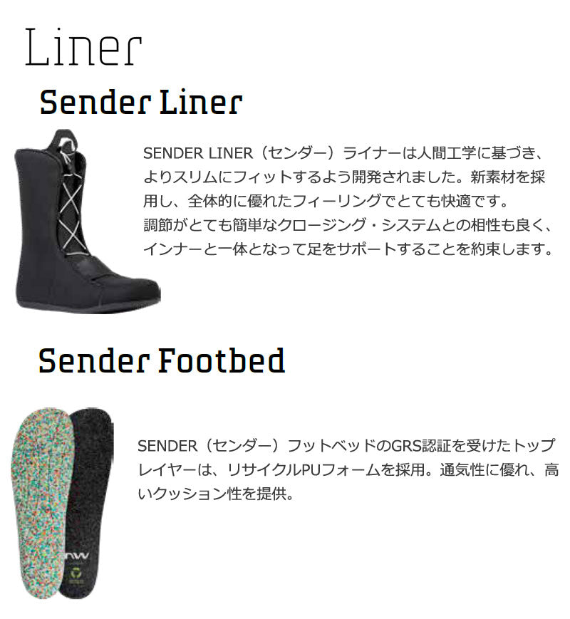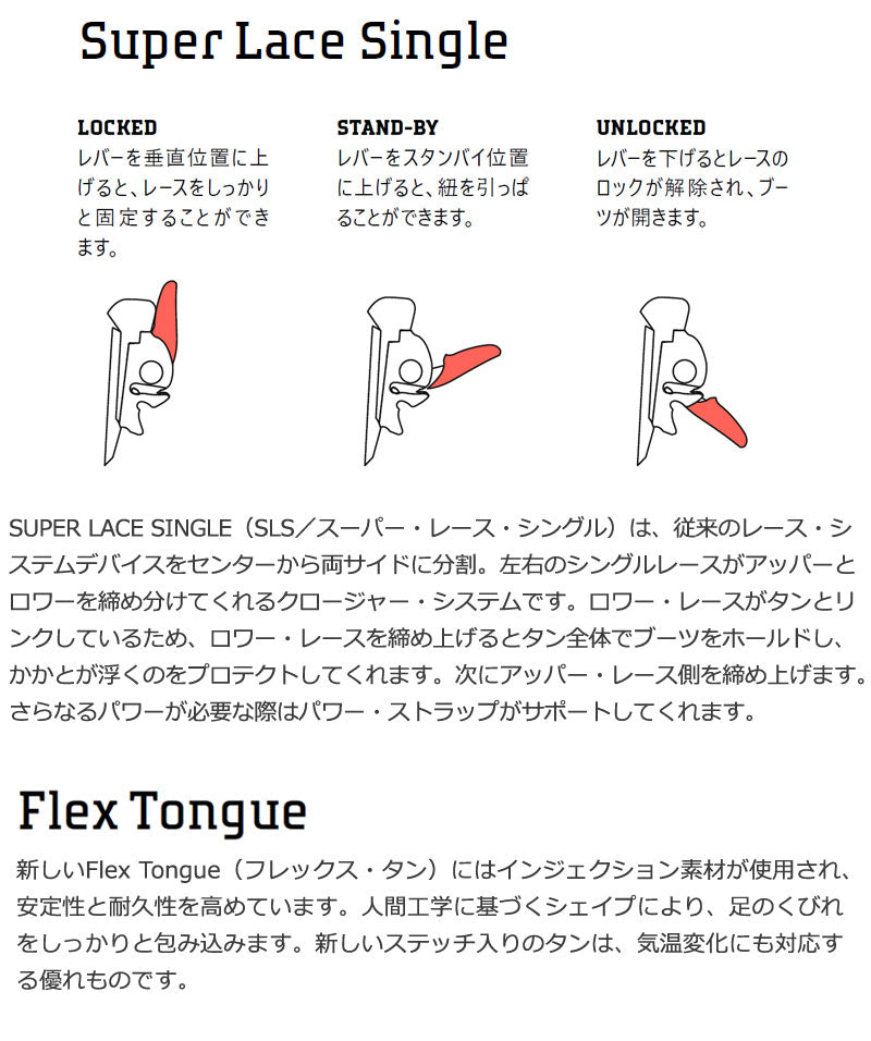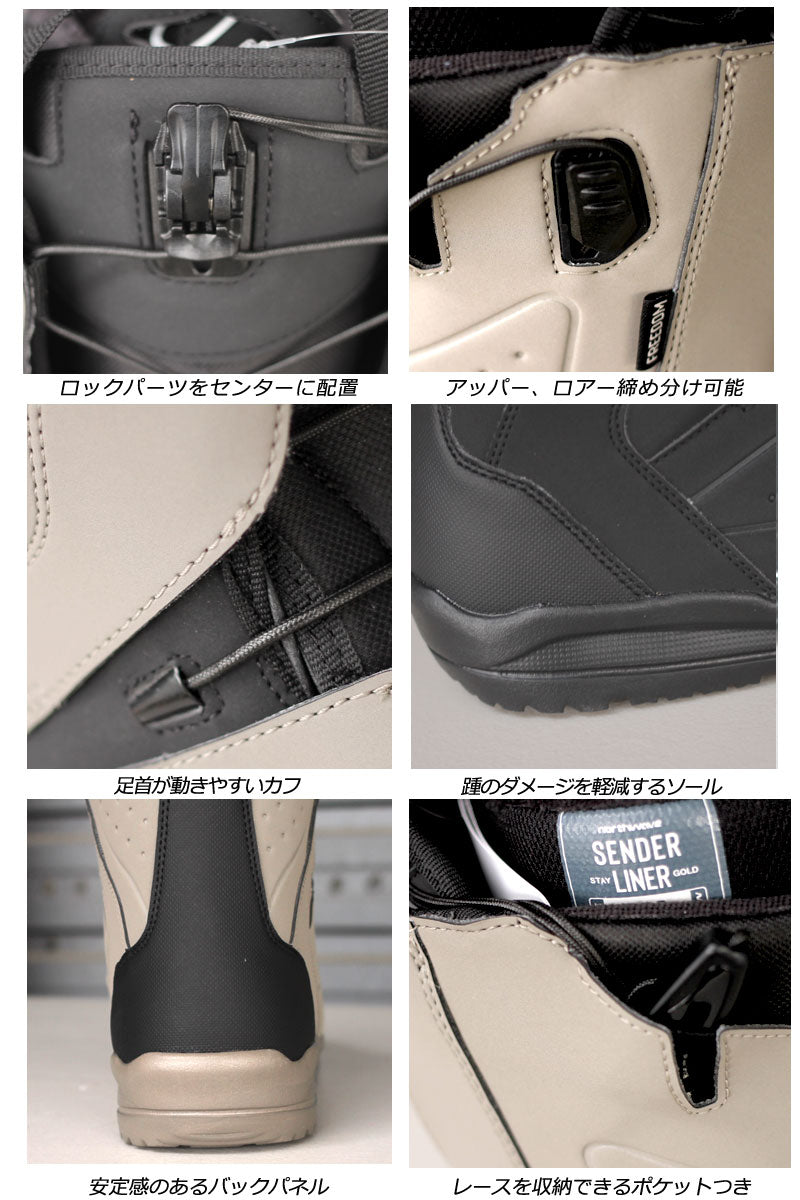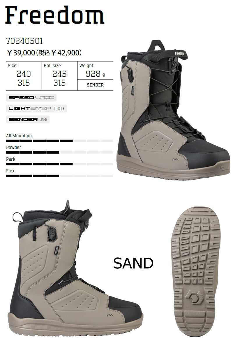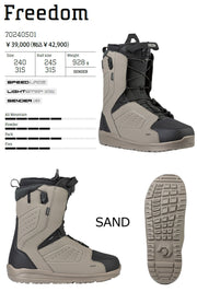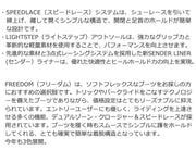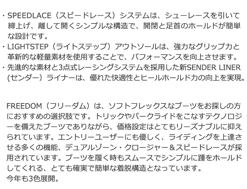 FREEDOM(フリーダム)は、ソフトフレックスなブーツをお探しの方におすすめの選択肢です。 トリックやパークライドをこなすテクノロジーを備えたブーツでありながら、価格設定はとてもリーズナブルに抑えられています。 エントリーユーザーにも優しく、ライディングを上達させる多くの機能、デュアルゾーン・クロージャー&スピードレースが採用されています。 ブーツを履く時もスムースでシンプルに踵をホールドしてくれる、とても確実で簡単な着脱構造となっています。今年も3色展開。 ・ SPEEDLACE(スピードレース)システムは、シューレースを引いて締上げ、離して開くシンプルな構造で、開閉と足首のホールドが簡単な設計です。 ・ LIGHTSTEP(ライトステップ)アウトソールは、強力なグリップ力と革新的な軽量素材を使用することで、パフォーマンスを向上させます。 ・ 先進的な素材と3点式レーシングシステムを採用した新SENDER LINER(センダー)ライナーは、優れた快適性とヒールホールド力の向上を実現。 ブーツとバインディングの相性やフィッティング、サイズ感に関して等、ご不明な点があればお気軽にお問い合わせください。サイズ交換も当店在庫有りの範囲で対応可能ですので、詳しくはサイズ交換リンクをご確認下さい。 |