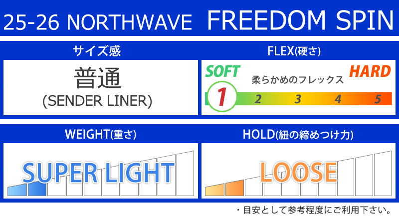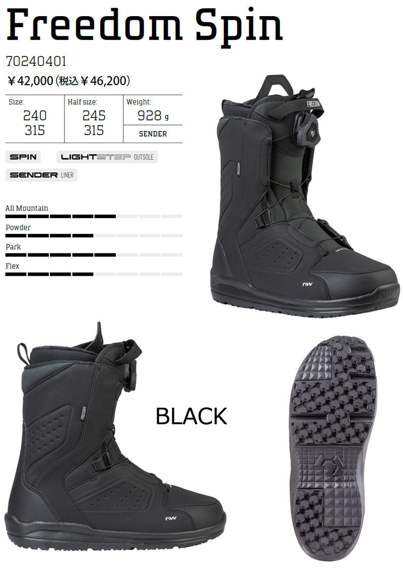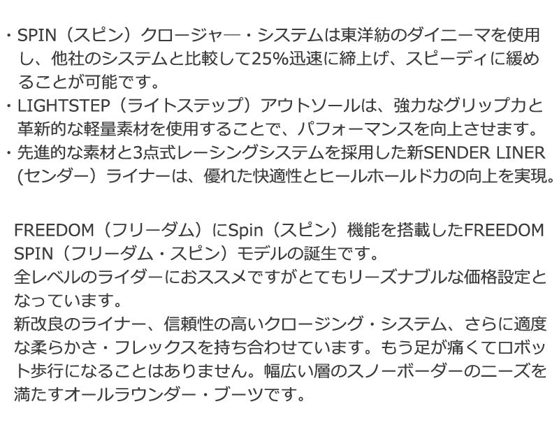 FREEDOM(フリーダム)にSpin(スピン)機能を搭載したFREEDOM SPIN(フリーダム・スピン)モデルの誕生です。全レベルのライダーにおススメですがとてもリーズナブルな価格設定となっています。 新改良のライナー、信頼性の高いクロージング・システム、さらに適度な柔らかさ・フレックスを持ち合わせています。 もう足が痛くてロボット歩行になることはありません。幅広い層のスノーボーダーのニーズを満たすオールラウンダー・ブーツです。 ・ SPIN(スピン)クロージャ―・システムは東洋紡のダイニーマを使用し、他社のシステムと比較して25%迅速に締上げ、スピーディに緩めることが可能です。 ・ LIGHTSTEP(ライトステップ)アウトソールは、強力なグリップ力と革新的な軽量素材を使用することで、パフォーマンスを 向上させます。 ・ 先進的な素材と3点式レーシングシステムを採用した新SENDER LINER(センダー)ライナーは、優れた快適性とヒールホールド力の向上を実現。 ブーツとバインディングの相性やフィッティング、サイズ感に関して等、ご不明な点があればお気軽にお問い合わせください。サイズ交換も当店在庫有りの範囲で対応可能ですので、詳しくはサイズ交換リンクをご確認下さい。 |