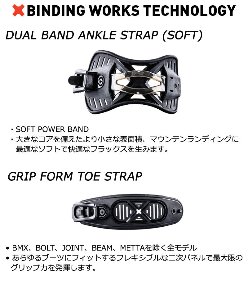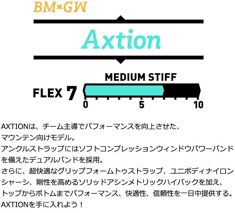 AXTIONは、チーム主導でパフォーマンスを高めたオールマウンテンの頼れる一足です。 デュアルバンドのアンクルストラップとソフトコンプレッションウィンドウパワーバンドを搭載。 さらに、非常に快適なグリップフォームトゥストラップ、一体型ナイロンシャーシ、そして剛性を高めるアシンメトリーハイバックを採用。 一日中、あらゆる場面でパフォーマンス、快適性、そして信頼性を体感できます。 AXTIONを手に入れましょう! バインディングとブーツの相性やフィッティングに関して等、ご不明な点があればお気軽にお問い合わせください。 ※滑走での振動やストラップの着脱等でビスを使用している部分は緩んできますので、締り具合など滑走前に必ずご確認をお願いします。またご使用のブーツとストラップの調整をお願いいたします。調整が適切でない場合、負荷が集中し破損の原因となります。 |
