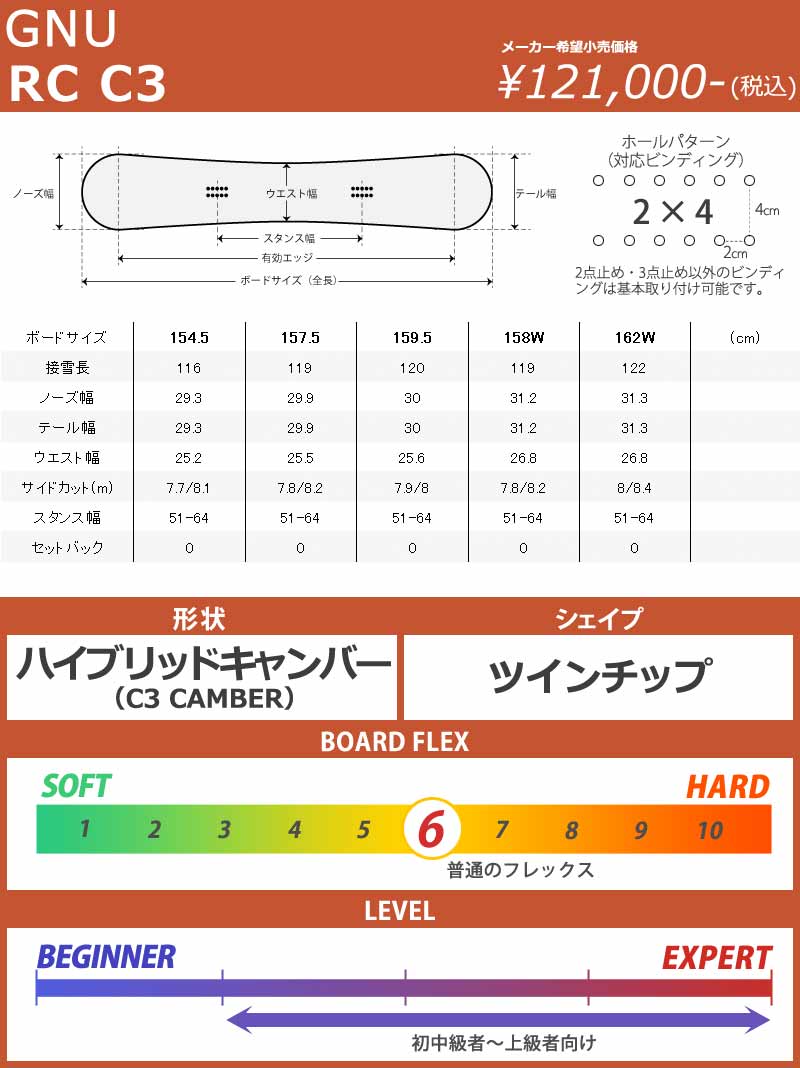 | 形状 | ハイブリッドキャンバー | シェイプ | ツインチップ |