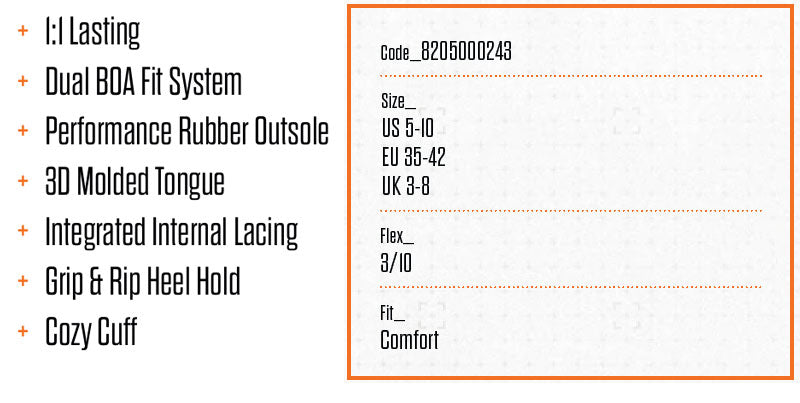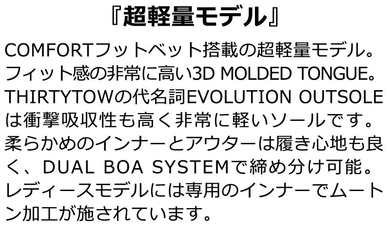 COMFORTフッドベッド搭載の超軽量モデル。フィット感の非常に高い3D MOLDED TONGUE。THIRTYTWOの代名詞EVOLUTION OUTSOLEは衝撃吸収性も高く非常に軽いソールです。柔らかめのインナーとアウターは履き心地もよく、DUAL BOA SYSTEMで締め分け可能。 ブーツとバインディングの相性やフィッティング、サイズ感に関して等、ご不明な点があればお気軽にお問い合わせください。サイズ交換も当店在庫有りの範囲で対応可能ですので、詳しくはサイズ交換リンクをご確認下さい。 |
