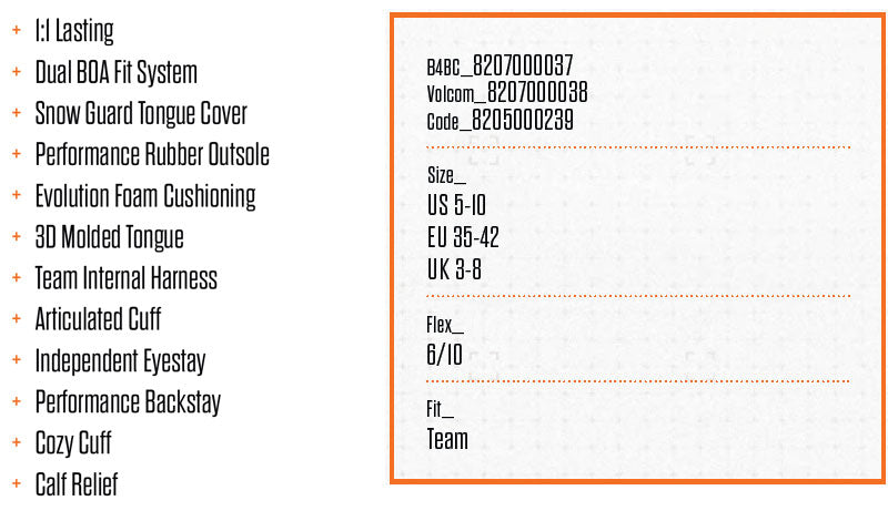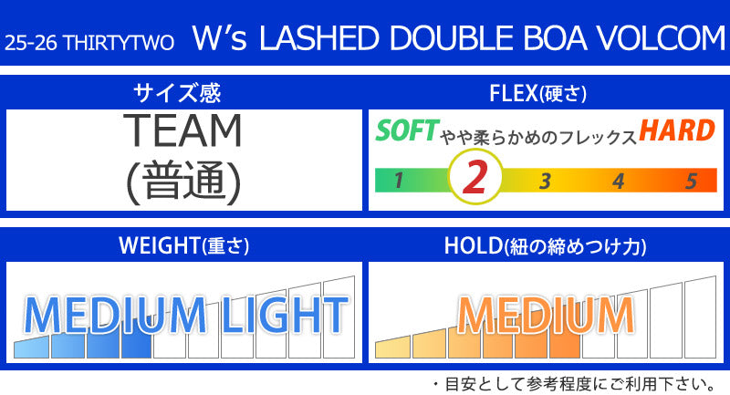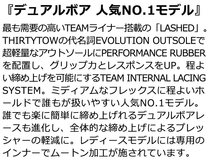 最も需要の高いTEAMライナー搭載のLASHED。THIRTYTWOの代名詞EVOLUTION OUTSOLEで超軽量なアウトソールにPERFORMANCE RUBBERを配置し、グリップ力とレスポンスをアップ。程よい締め上げを可能にするTEAM INTERNATIONAL LACING SYSTEM。ミディアムなフレックスに程よいホールドで誰もが扱いやすいNo1モデル。VOLCOMコラボカラー。 ブーツとバインディングの相性やフィッティング、サイズ感に関して等、ご不明な点があればお気軽にお問い合わせください。サイズ交換も当店在庫有りの範囲で対応可能ですので、詳しくはサイズ交換リンクをご確認下さい。 |
