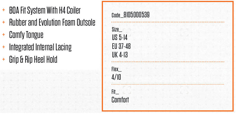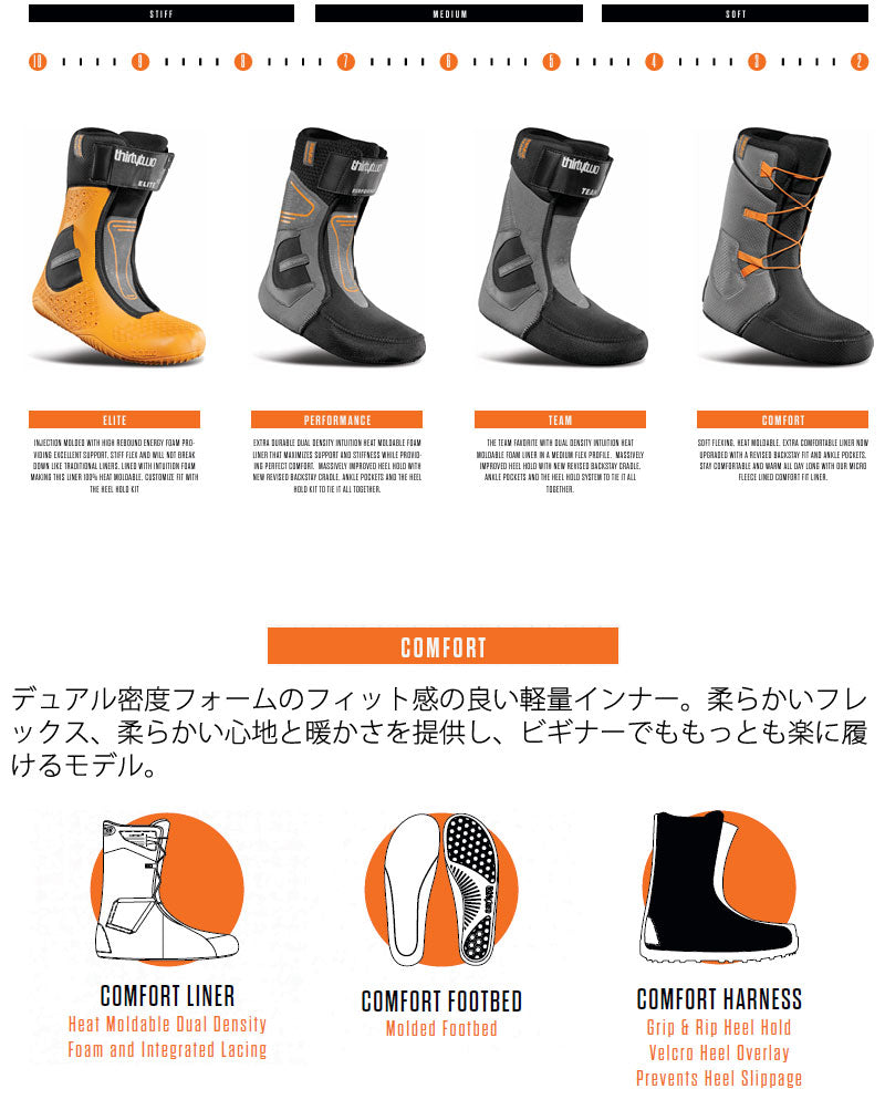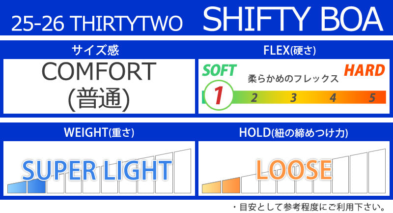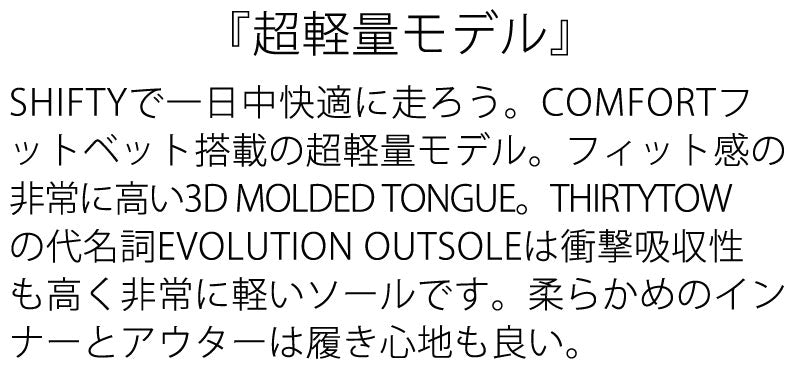 SHIFTYで一日中快適に走ろう。COMFORTフッドベッド搭載の超軽量モデル。フィット感の非常に高い3D MOLDED TOUNGUE。THIRTYTWOの代名詞EVOLUTION OUTSOLEは衝撃吸収性も高く非常に軽いソールです。 ブーツとバインディングの相性やフィッティング、サイズ感に関して等、ご不明な点があればお気軽にお問い合わせください。サイズ交換も当店在庫有りの範囲で対応可能ですので、詳しくはサイズ交換リンクをご確認下さい。 |
