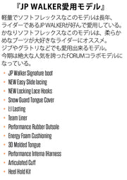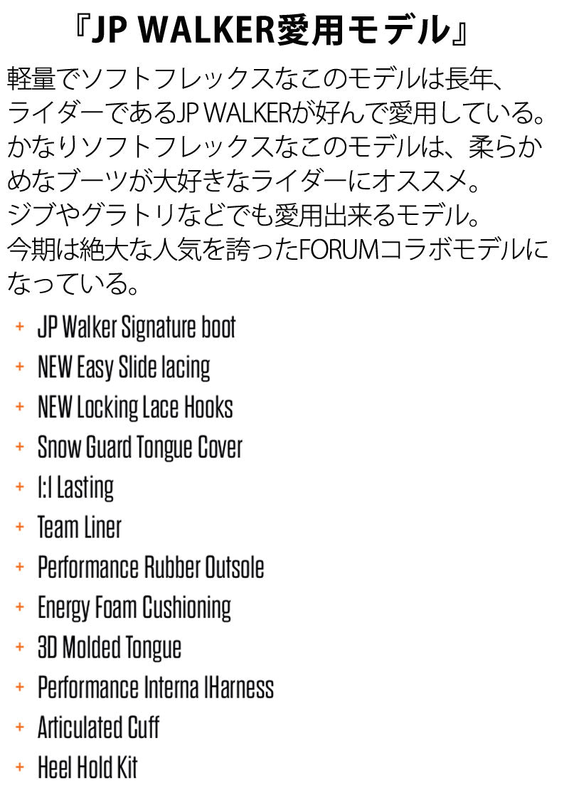 軽量でソフトフレックスなこのモデルは、長年ライダーである、JP WALKERが好んで愛用している。かなりソフトなフレックスなこのモデルは、柔らかめなブーツが大好きなライダーにオススメ。ジブやグラトリなどでも愛用できるモデル。今期は絶大な人気を誇ったFORUMコラボモデル。 ブーツとバインディングの相性やフィッティング、サイズ感に関して等、ご不明な点があればお気軽にお問い合わせください。サイズ交換も当店在庫有りの範囲で対応可能ですので、詳しくはサイズ交換リンクをご確認下さい。 |