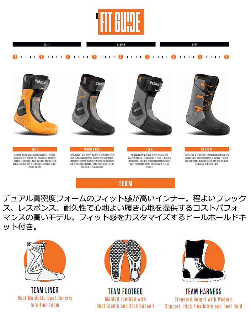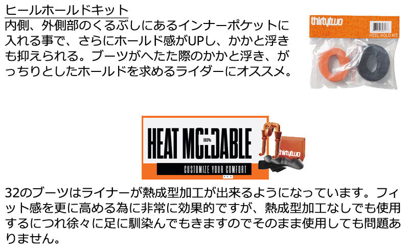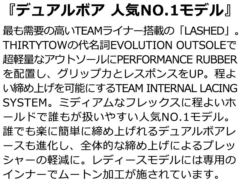 最も需要の高いTEAMライナー搭載のLASHED。THIRTYTWOの代名詞EVOLUTION OUTSOLEで超軽量なアウトソールにPERFORMANCE RUBBERを配置し、グリップを可能にするTEAM INTERNAL LACING SYSTEM。ミディアムなフレックスに程よいホールドで誰もが扱いやすい人気No1モデル。 ブーツとバインディングの相性やフィッティング、サイズ感に関して等、ご不明な点があればお気軽にお問い合わせください。サイズ交換も当店在庫有りの範囲で対応可能ですので、詳しくはサイズ交換リンクをご確認下さい。 |