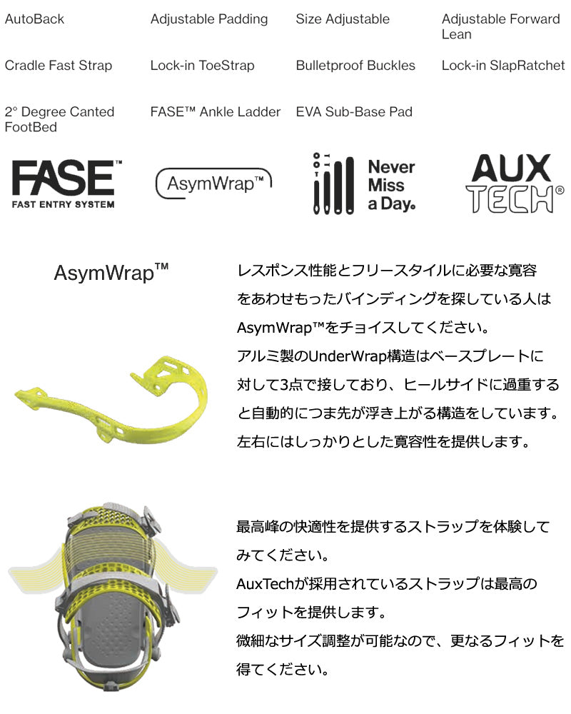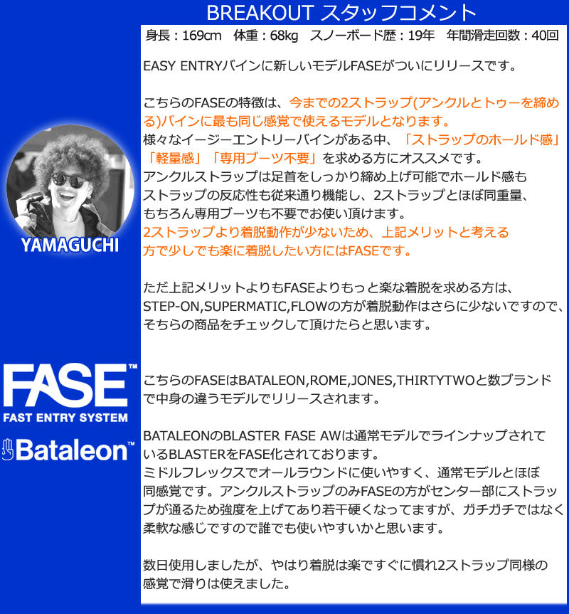 汎用性に優れたこのオールマウンテンバインディングは全てのターンに正確性と快適性を求めるライダーたちのために作られています。 革新的なFASE Fast Entry Systemが搭載されているので、感覚的で簡単な脱着が可能なのでリフトからの滑り出しを素早くを行うことが可能です。 軽量なアルミフレームは左右のフレックス機能を提供しながら、しっかりとしたエッジトゥエッジを可能にします。 3D AuxTech? Cradle FastStrapsはブーツをしっかりと包み込むことで高いホールド感を生み、高レスポンスバインディングに仕上げます。 こちらはBEYOND MEDALSのトール・ランドストロムモデル。 このプロジェクトは複数のブランドがかかわった巨大コラボレーションプロジェクトです。 構想は6年前から始まり、新たな革新的バインディングをマーケットに届けることができるよう多くの人間が尽力してきました。 イージーエントリーやファストエントリーというカテゴリーが大きなブームとなっている昨今、私たちはブームにただ乗っかるということはしたくありませんでした。 もし自分たちがファストエントリーバインディングをリリースするのであれば、パフォーマンスを最重要視し、利点を作るために欠点を作り出すようなことは決してしてはならないと強く感じていました。 だからこそ6年という歳月を費やし、欠点のないバインディングを作り上げたのです。 FaseはFast Entryカテゴリーにおいて始めてプロライダーが使用できる高パフォーマンスバインディングをリリースします。 ※滑走での振動やストラップの着脱等でビスを使用している部分は緩んできますので、締り具合など滑走前に必ずご確認をお願いします。 またご使用のブーツとストラップの調整をお願いいたします。 調整が適切でない場合、負荷が集中し破損の原因となります。 バインディングとブーツの相性やフィッティングに関して等、ご不明な点があればお気軽にお問い合わせください。 ※滑走での振動やストラップの着脱等でビスを使用している部分は緩んできますので、締り具合など滑走前に必ずご確認をお願いします。またご使用のブーツとストラップの調整をお願いいたします。調整が適切でない場合、負荷が集中し破損の原因となります。 |