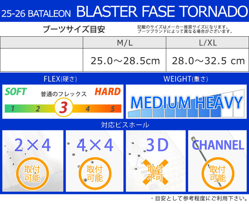 | ベストマッチブーツ | ・BATALEON/バタレオン ※ご使用サイズやモデル等で変わる部分もございますのであくまで目安としてお考え下さい。 こちらに記載以外のバインディングにも使用可能です。 |