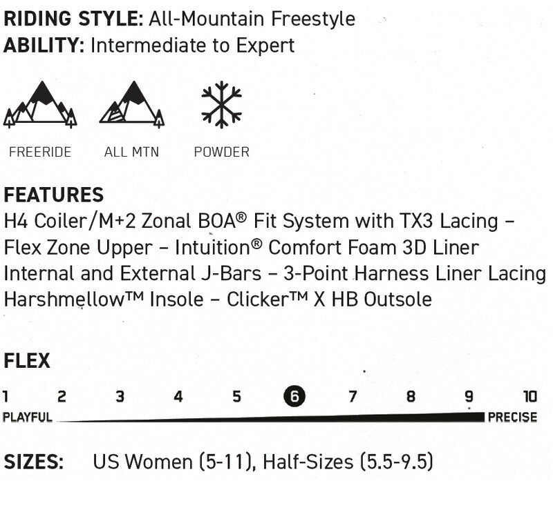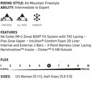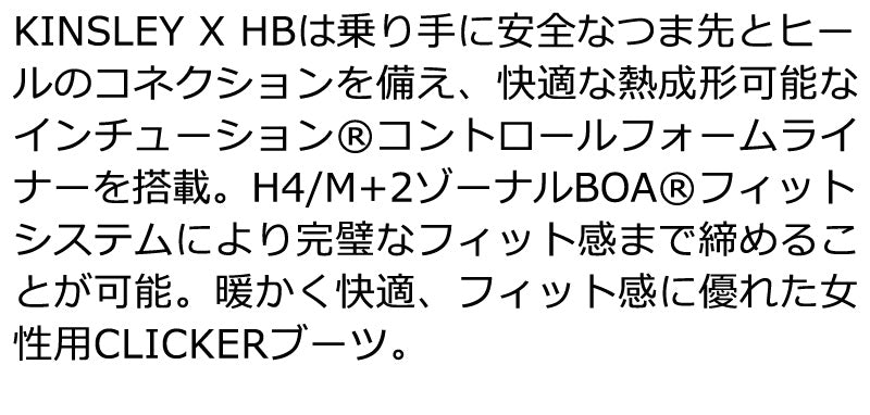 KINSLEY X HBは乗り手に安全なつま先とヒールのコネクションを備え、 快適な熱成形可能なインチューションコントロールフォームライナーを搭載。H4/M+2ゾーナルBOAフィットシステムにより完璧なフィット感まで締めることが可能。暖かく快適、フィット感に優れた女性用CLICKERブーツ。