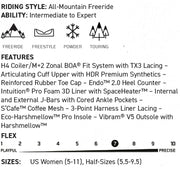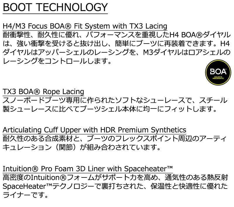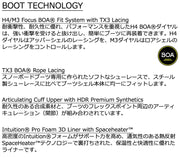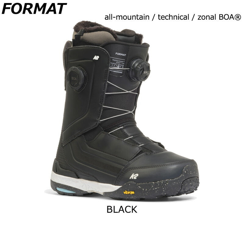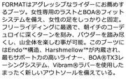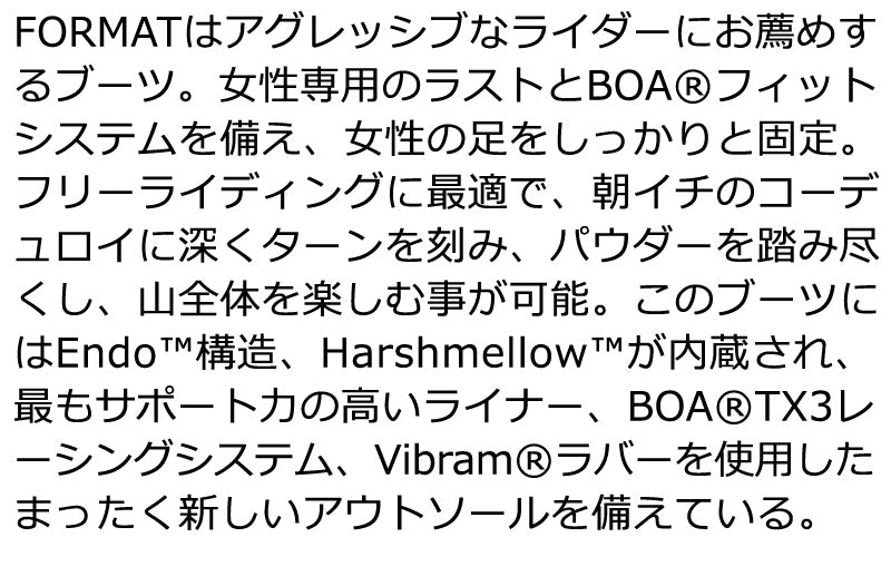 FORMATはアグレッシブなライダーにお薦めするブーツ。女性専用のラストとBOAフィットシステムを備え、女性の足をしっかりと固定。フリーライディングに最適で、朝イチのコーデュロイに深くターンを刻み、パウダーを踏み尽くし、山全体を楽しむ事が可能。このブーツにはEndo構造、Harshmellowが内蔵され、最もサポート力の高いライナー、BOATX3レーシングシステム、Vibramラバーを使用したまったく新しいアウトソールを備えている。