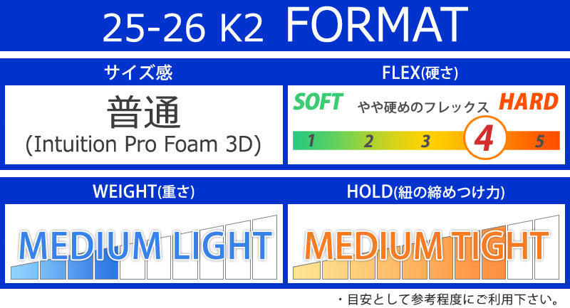 | ベストマッチ ビンディング | ・K2/ケーツー ※ご使用サイズやモデル等で変わる部分もございますのであくまで目安としてお考え下さい。 こちらに記載以外のバインディングにも使用可能です。 |