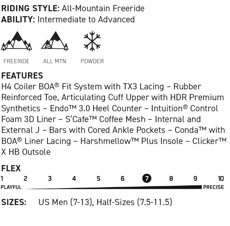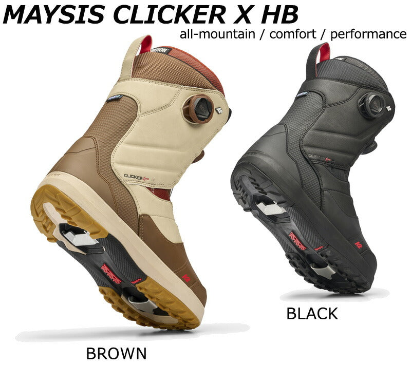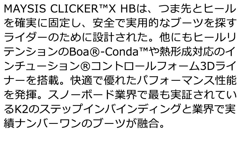 MAYSIS CLICKER X HBは、つま先とヒールを確実に固定し、安全で実用的なブーツを探すライダーのために設計された。他にもヒールリテンションのBoa-Conda や熱形成対応のインチューションコントロールフォーム3Dライナーを搭載。快適で優れたパフォーマンス性能を発揮。スノーボード業界で最も実証されているK2のステップインバインディングと業界で実績ナンバーワンのブーツが融合。