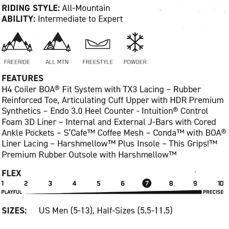 MAYSISはプレミアムなラバーアウトソールを装備し、インナーには熱成型可能なインチューションコントロールフォームライナーとBOAコンダを採用し、快適なフィット感と履き心地を実現した長年のベストセラー。最新のEndo 3.0テクノロジーを採用。チームライダーの多くが愛用する高性能なオールマウンテン・ブーツ。