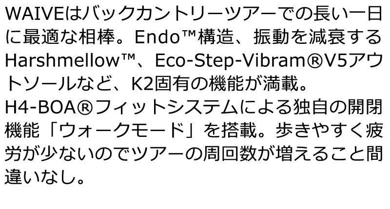 WAIVEはバックカントリーツアーでの長い一日に最適な相棒。Endo構造、振動を減衰するHarshmellow、Eco-Step-VibramV5アウトソールなど、K2固有の機能が満載。H4-BOAフィットシステムによる独自の開閉機能「ウォークモード」を搭載。歩きやすく疲労が少ないのでツアーの周回数が増えること間違いなし。