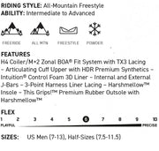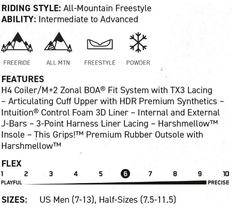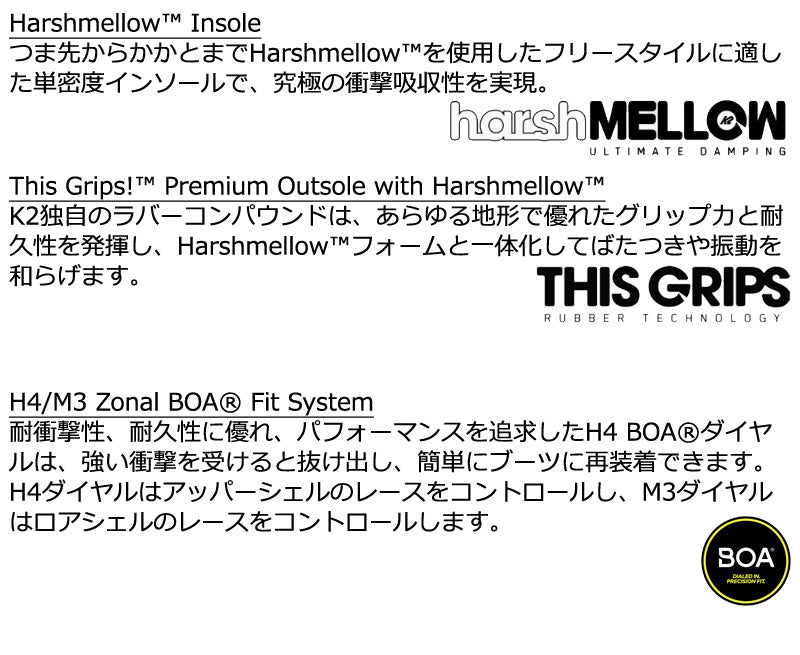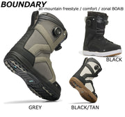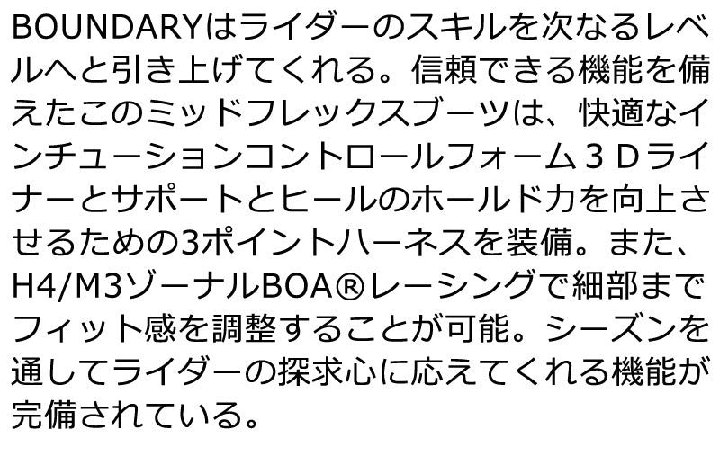 BOUNDARYはライダーのスキルを次なるレベルへと引き上げてくれる。信頼できる機能を備えたこのミッドフレックスブーツは、快適なインチューションコントロールフォーム3Dライナーとサポートとヒールのホールド力を向上させるための3ポイントハーネスを装備。また、H4/M3ゾーナルBOAレーシングで細部までフィット感を調整することが可能。シーズンを通してライダーの探求心に応えてくれる機能が完備されている。