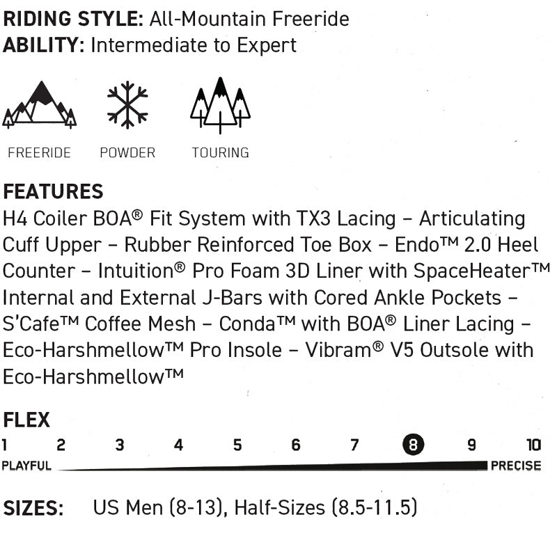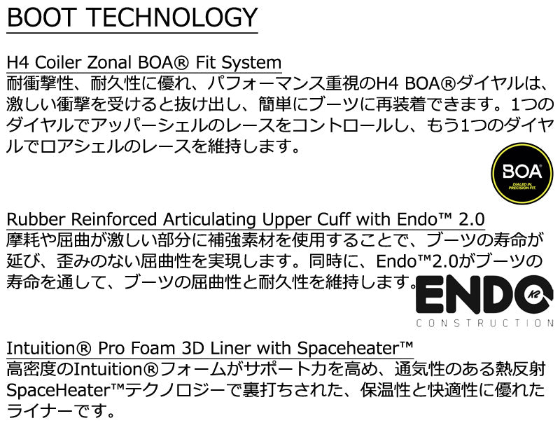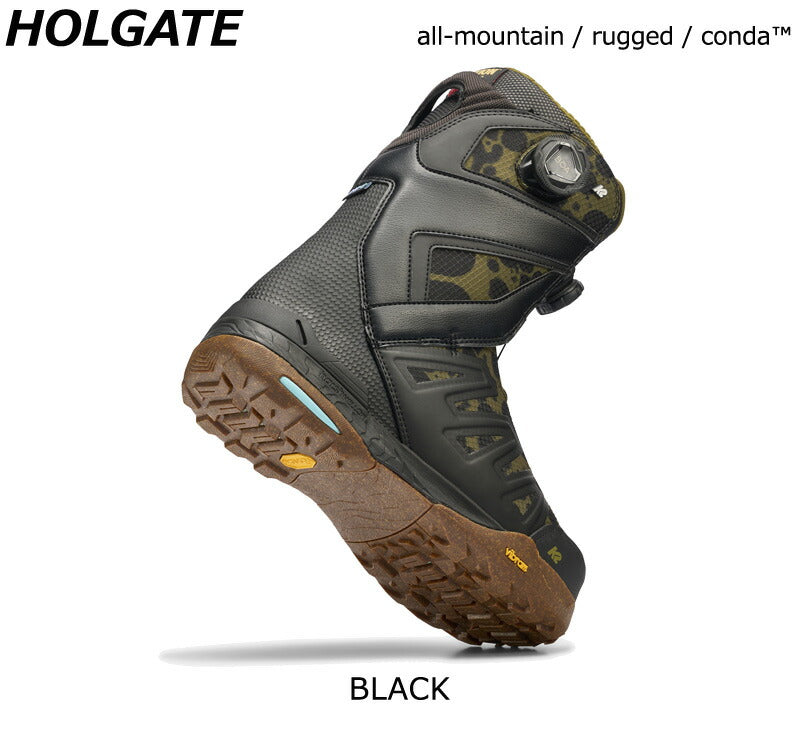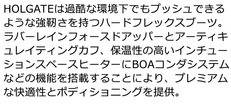 HOLGATEは過酷な環境下でもプッシュできるような強靭さを持つハードフレックスブーツ。ラバーレインフォースドアッパーとアーティキュレイティングカフ、保温性の高いインチューションスペースヒーターにBOAコンダシステムなどの機能を搭載することにより、 プレミアムな快適性とポディショニングを提供。