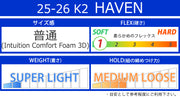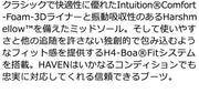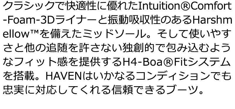 クラシックで快適性に優れたIntuitionComfort-Foam-3Dライナーと振動吸収性のあるHarshmellowを備えたミッドソール。そして使いやすさと他の追随を許さない独創的で包み込むようなフィット感を提供するH4-BoaFitシステムを搭載。HAVENはいかなるコンディションでも忠実に対応してくれる信頼できるブーツ。