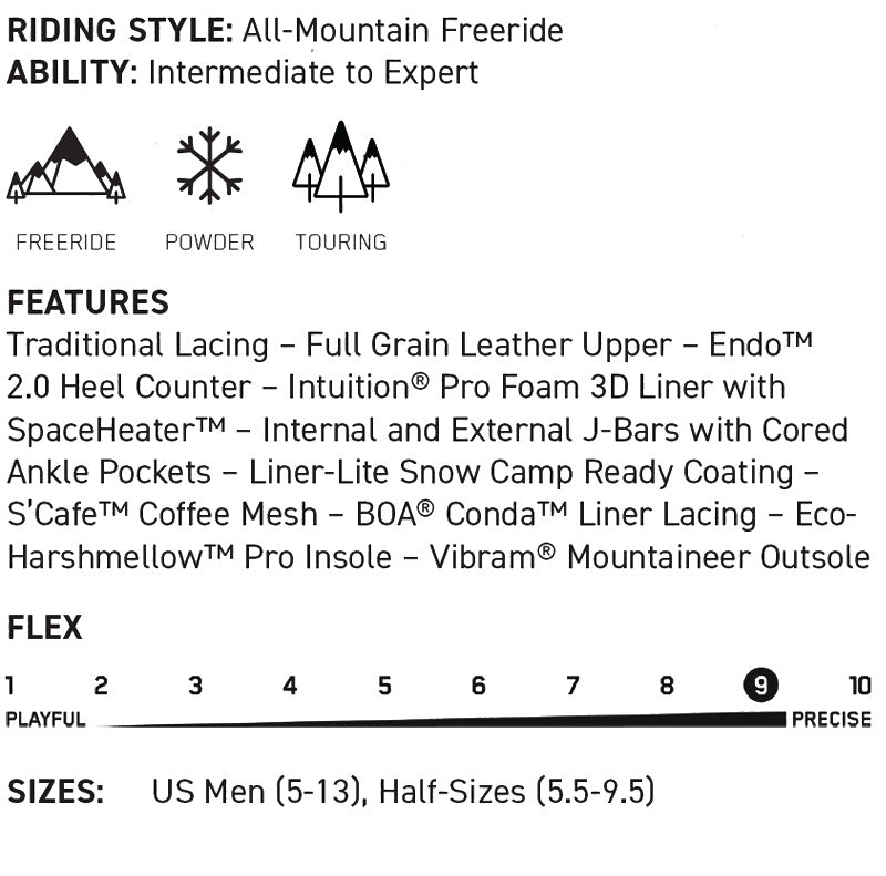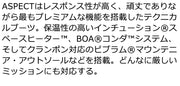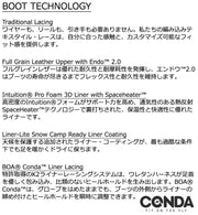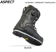 ASPECTはレスポンス性が高く、頑丈でありながら最もプレミアムな機能を搭載したテクニカルブーツ。保温性の高いインチューションスペースヒーター、BOAコンダシステム、そしてクランポン対応のビブラムマウンテニア・アウトソールなどを搭載。どんなに厳しいミッションにも対応する。