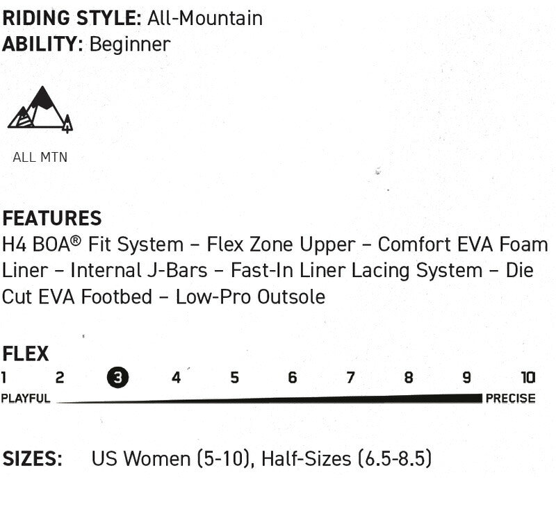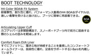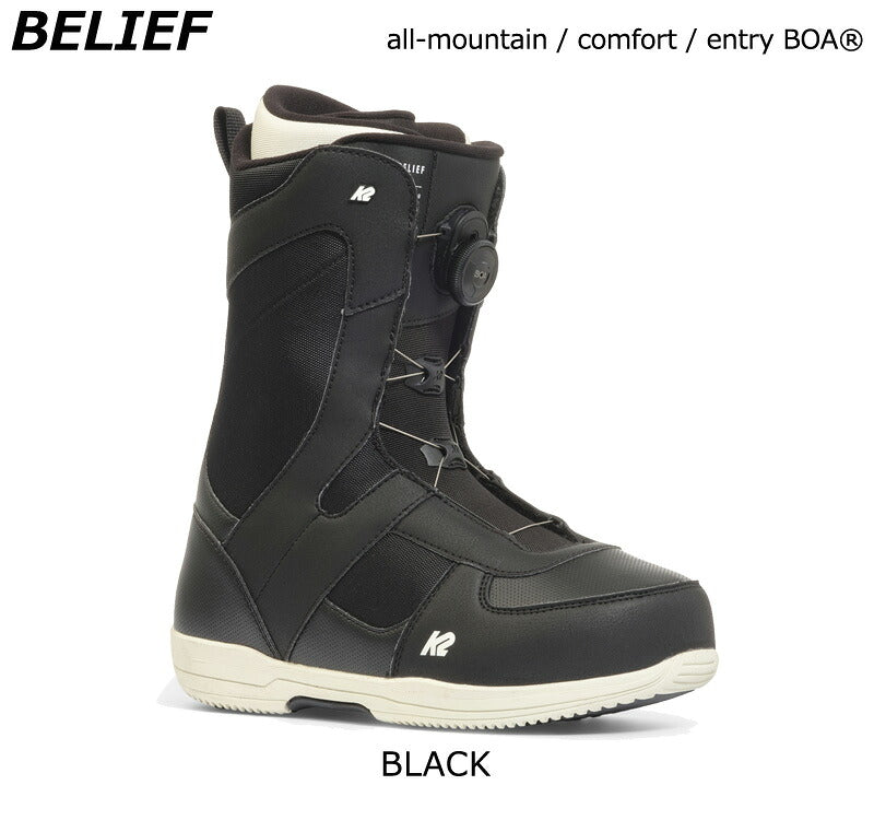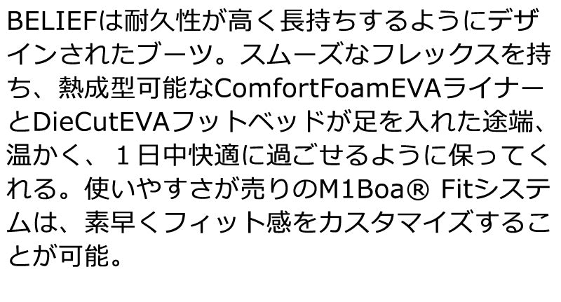 BELIEFは耐久性が高く長持ちするようにデザインされたブーツ。スムーズなフレックスを持ち、熱成型可能なComfort Foam EVAライナーとDie Cut EVAフットベッドが足を入れた途端、温かく、1日中快適に過ごせるように保ってくれる。使いやすさが売りのM1Boa Fitシステムは、素早くフィット感をカスタマイズすることが可能。