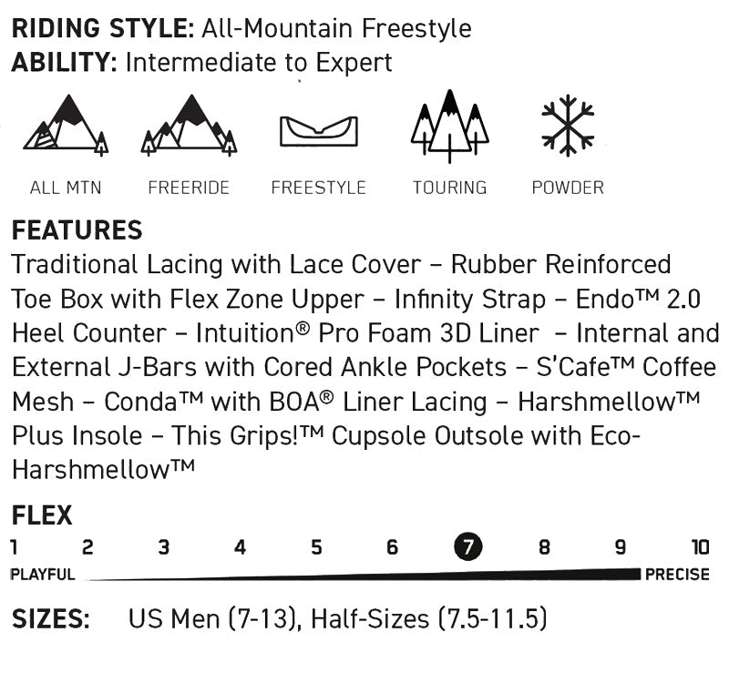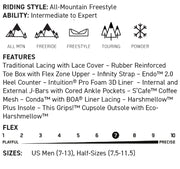 EVASIONはフリーライドスタイルとパフォーマンスを融合させたカーティス・シジックのシグネチャーモデル。優れた快適性、サポート性、耐久性を備えており、人混みを避けてサイドカントリーの柔らかい雪を楽しみたい人にはマストアイテム。ミッドソールにハーシュメロウバイブレーションダンピングテクノロジーを採用。また、エンドウ2.0構造とセミアーティキュレーションシェルを組み合わせることで、ターン、グラブ、着地時にスムーズで歪みのないフレックスを実現する。