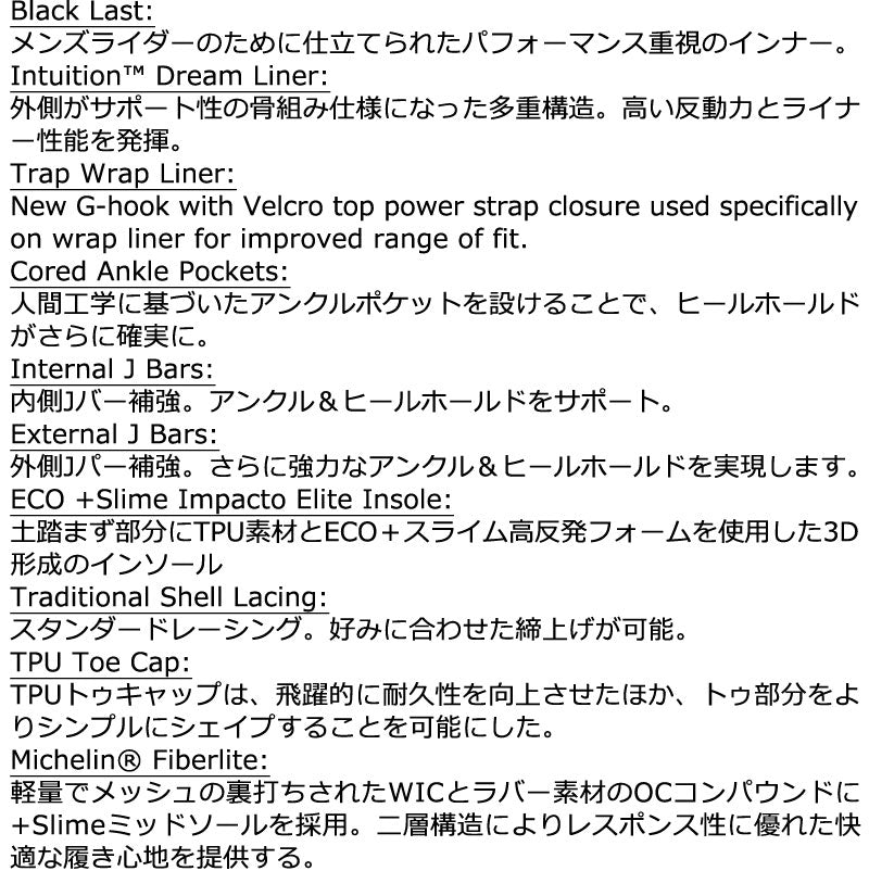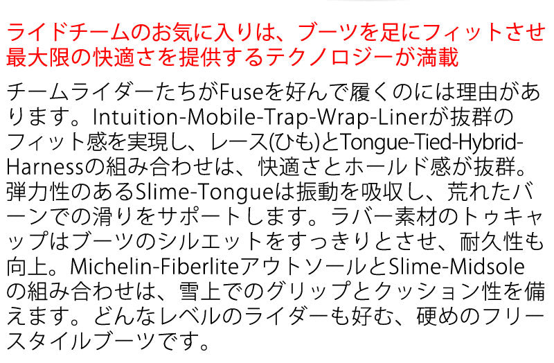 コメント チームライダーが好んで履くのには理由がある。抜群のフィット感を実現し、レースとTongue Tied Hybrid Harnessの組み合わせは、快適さとホールド感が抜群。弾力性のあるSlime Toungueは振動吸収し、荒れたバーンでの滑りをサポートします。ラバー素材のtぅーキャップはブーツのシルエットをすっきりとさせ、耐久性も向上。