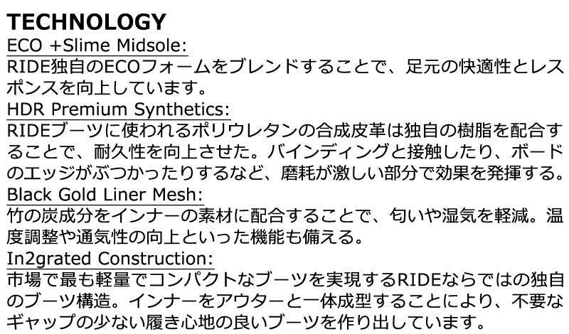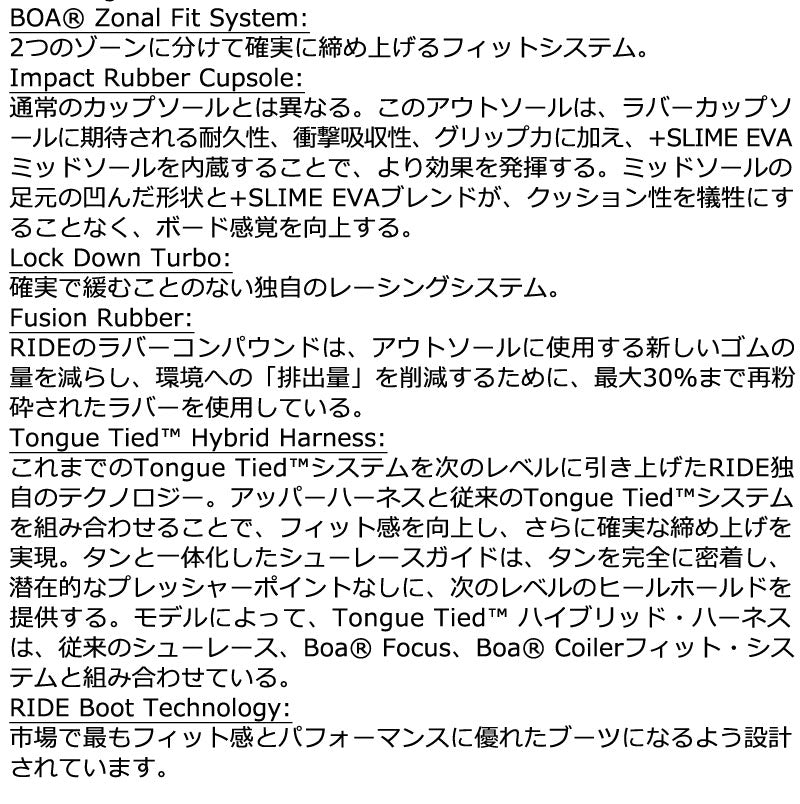 | ベストマッチ ビンディング | ・RIDE/ライド ※ご使用サイズやモデル等で変わる部分もございますのであくまで目安としてお考え下さい。 こちらに記載以外のバインディングにも使用可能です。 |