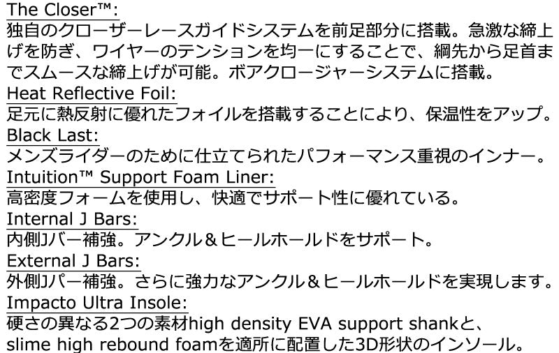 快適性とサポート性を兼ね備えた反応性の高いオールマウンテンフリースタイルブーツで、最も需要なライディングの向上に集中できます。抜群のフィット感を約束し、BOA Zonal Fit Systemは、足をしっかりとホールド。 ブーツとバインディングの相性やフィッティング、サイズ感に関して等、ご不明な点があればお気軽にお問い合わせください。サイズ交換も当店在庫有りの範囲で対応可能ですので、詳しくはサイズ交換リンクをご確認下さい。 |